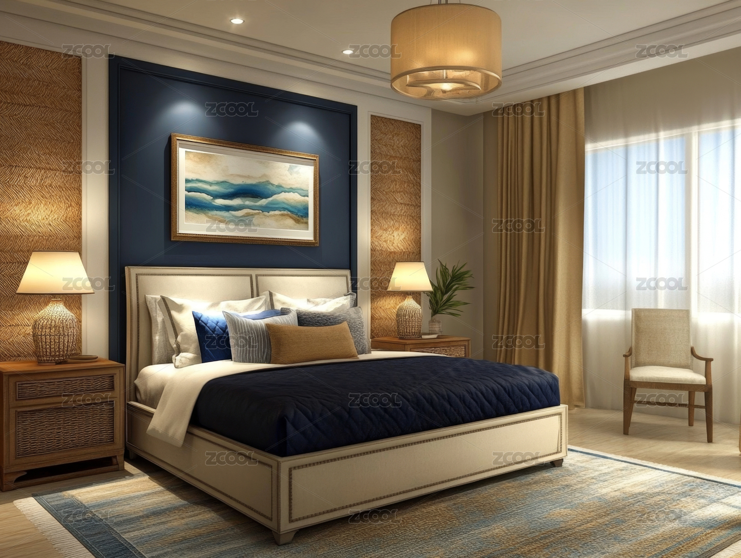卧室,现代,乡村,风格,床,枕头,窗帘,灯具,装饰画,地毯