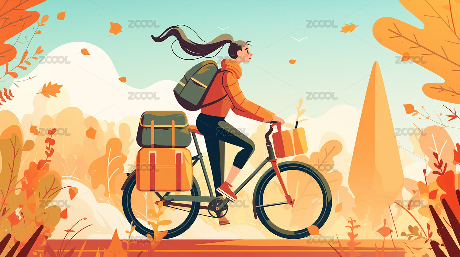 学生,自行车,背包,文件夹,秋天,树叶,城市,蓝天,白鸽