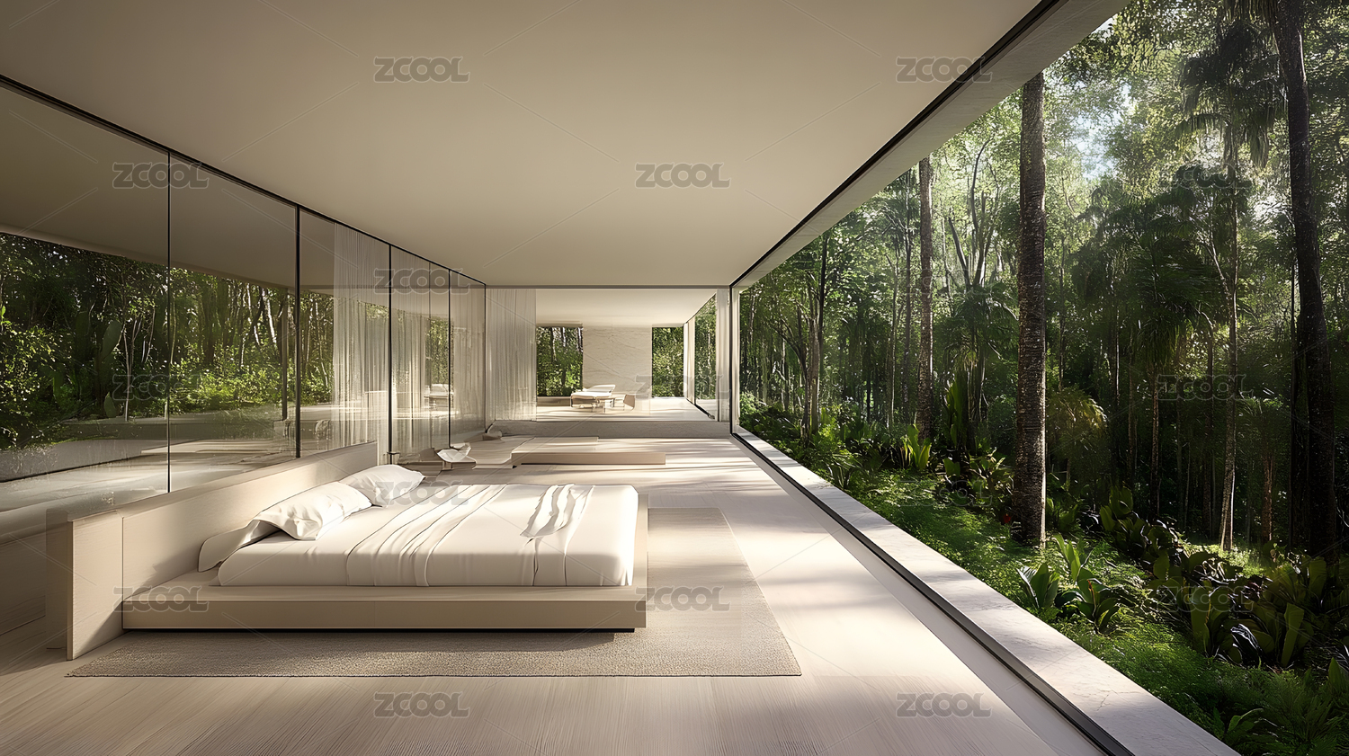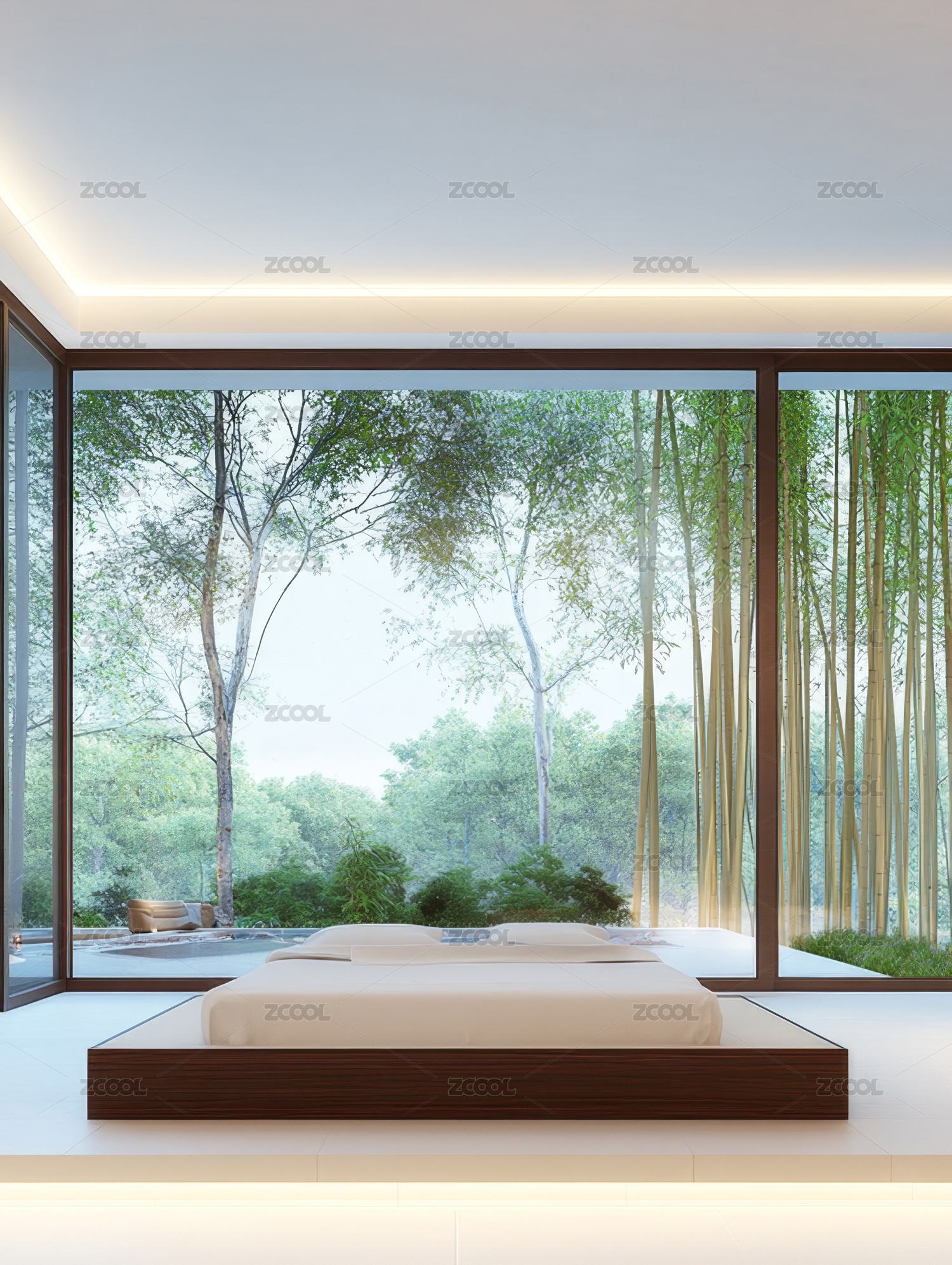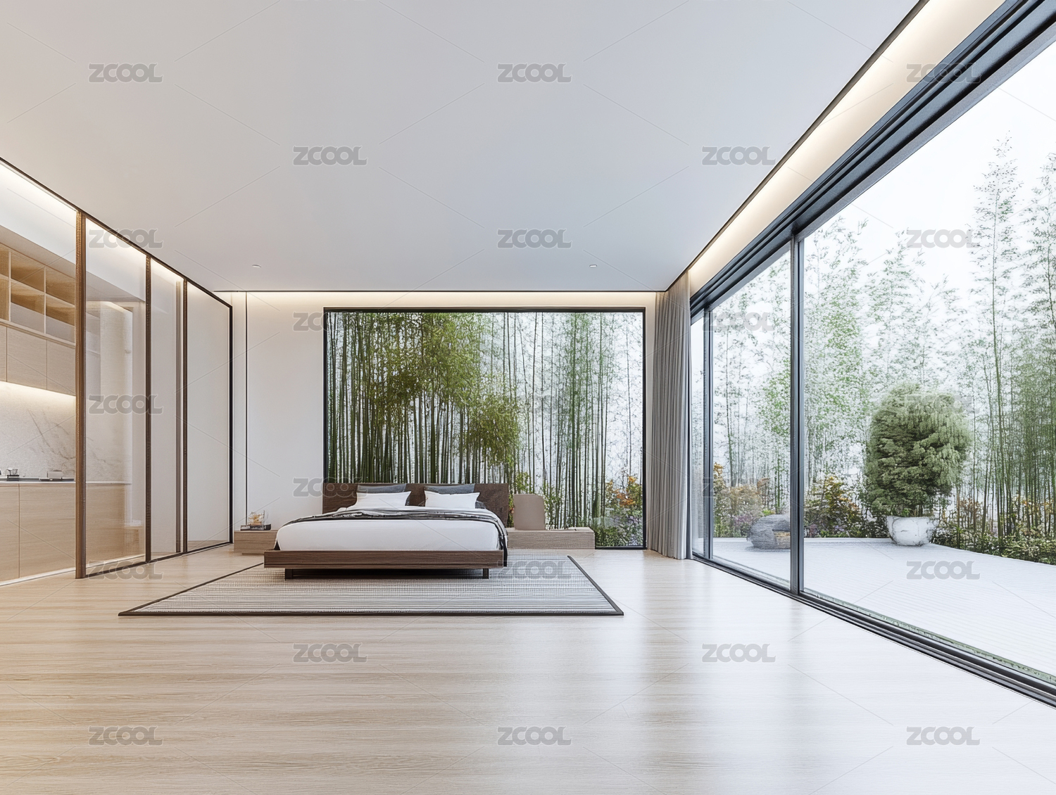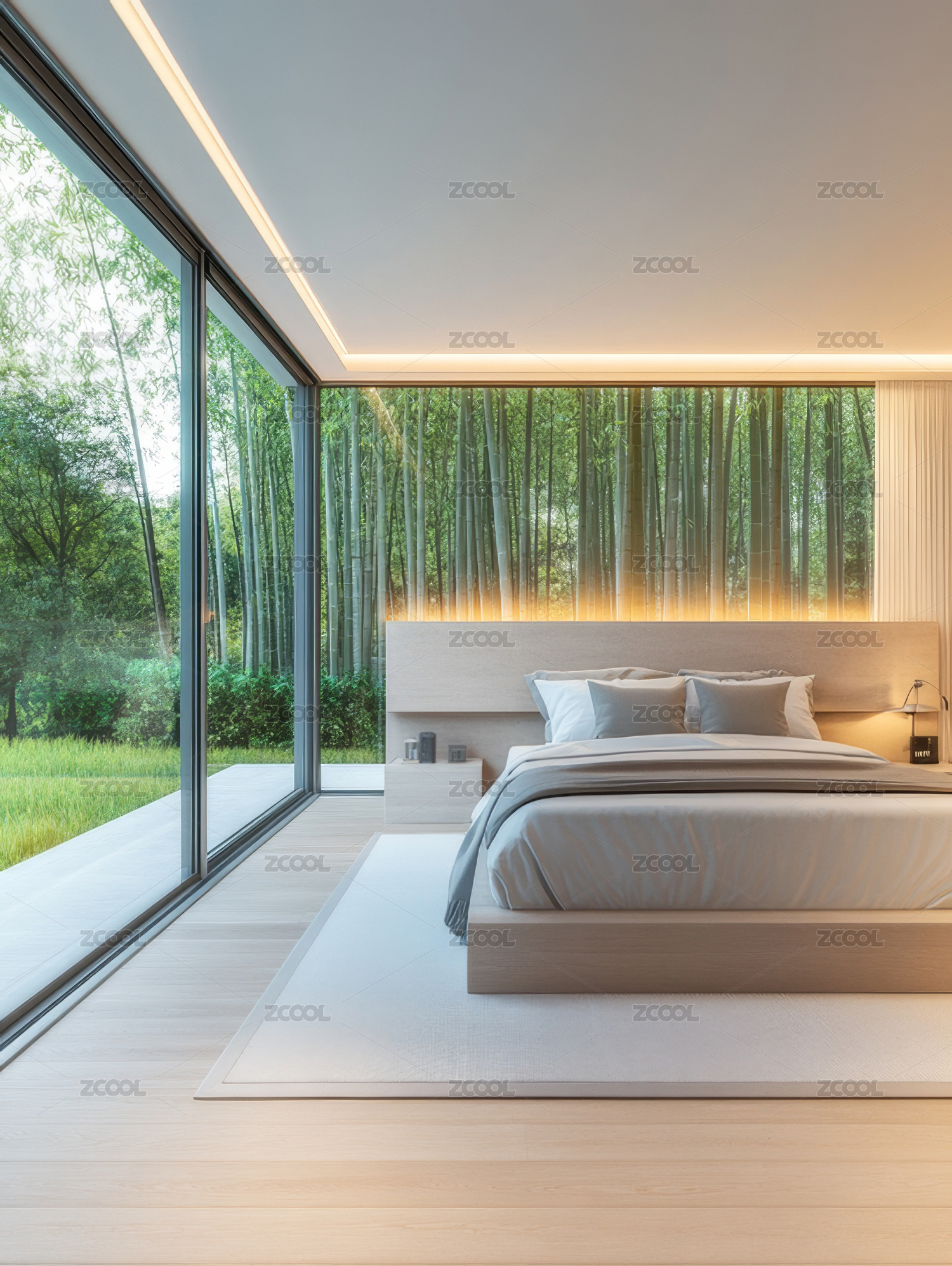 卧室,现代,简约,大窗,自然,景观,木质,地板,白色,墙壁