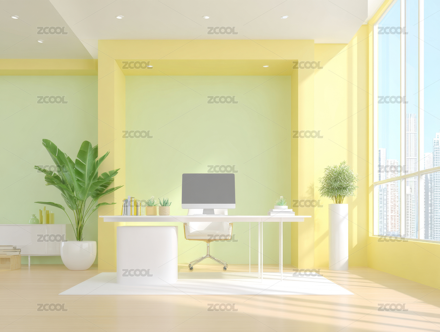 办公室,现代,室内,设计,植物,书架,办公桌,橙色墙,自然光,绿色