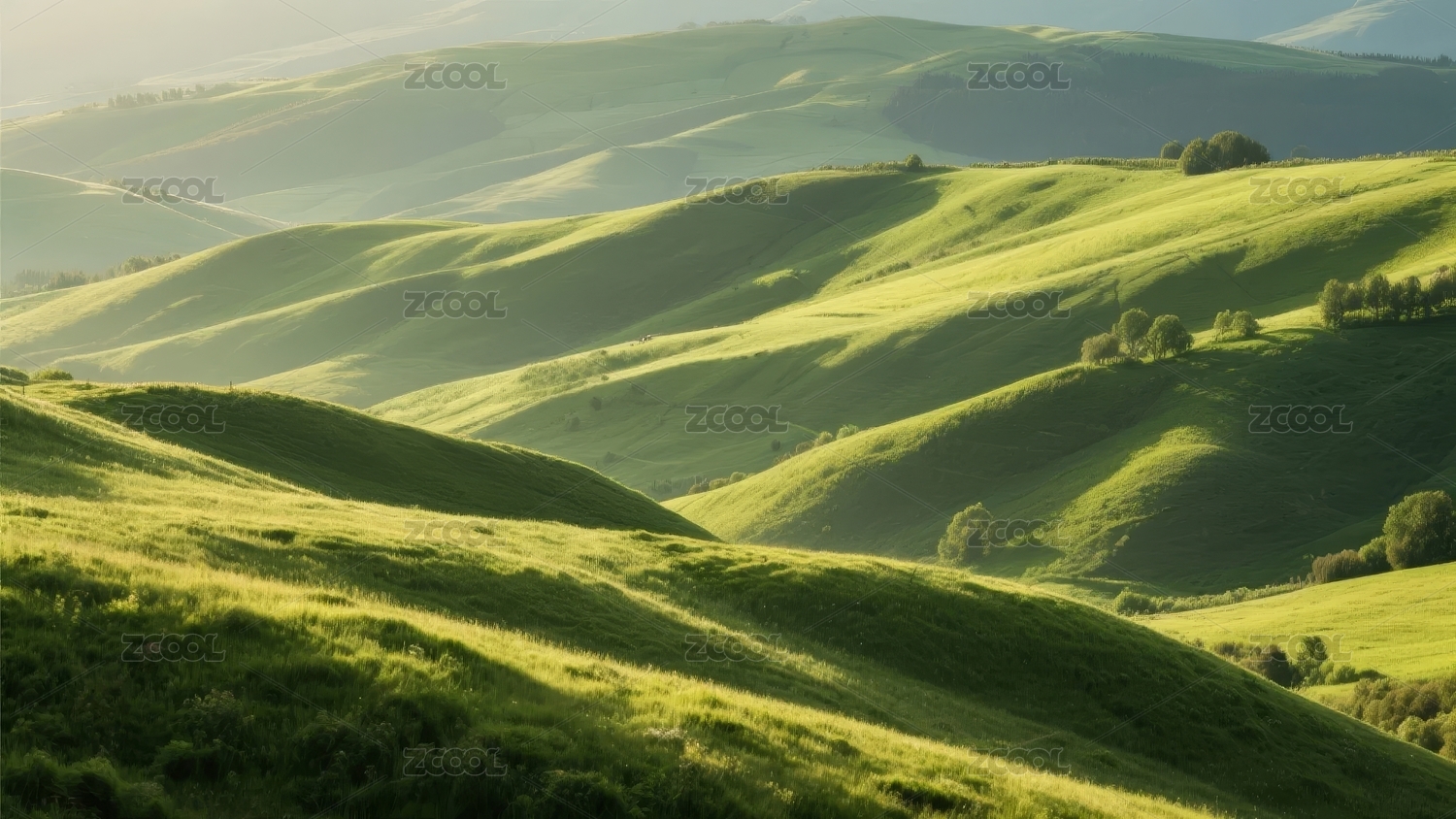 晨光洒在起伏的绿色山丘上