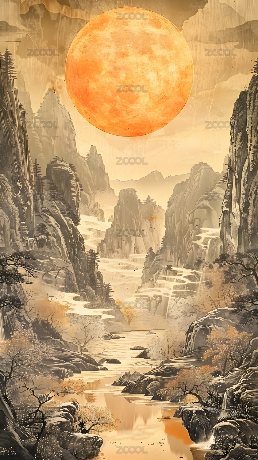 金色月亮下的水墨山水画