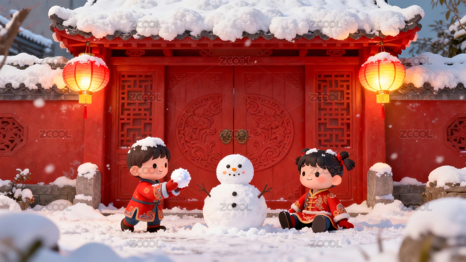 冬日雪夜,孩童堆雪人,红灯笼与礼物营造温
