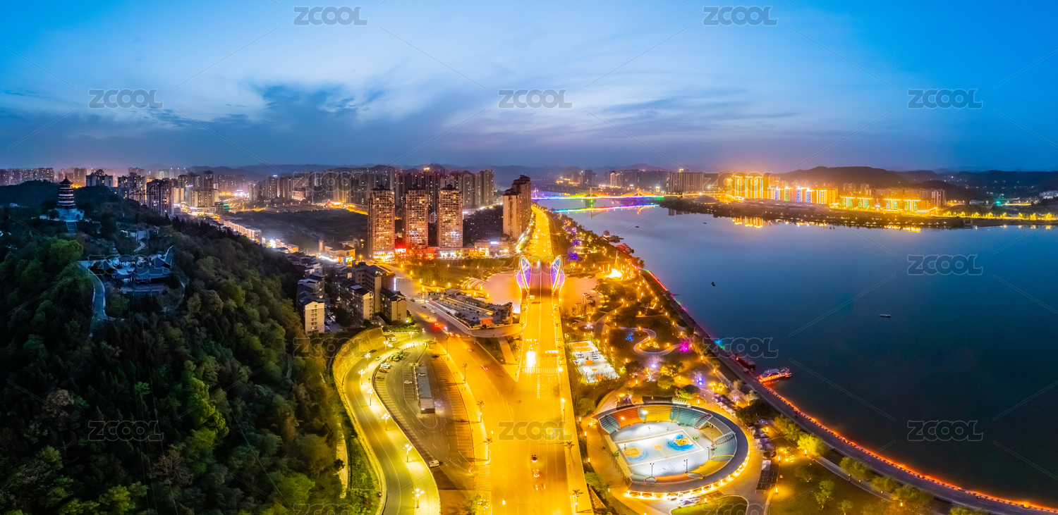 中国四川省南部县夜晚嘉陵江外滩高楼建筑