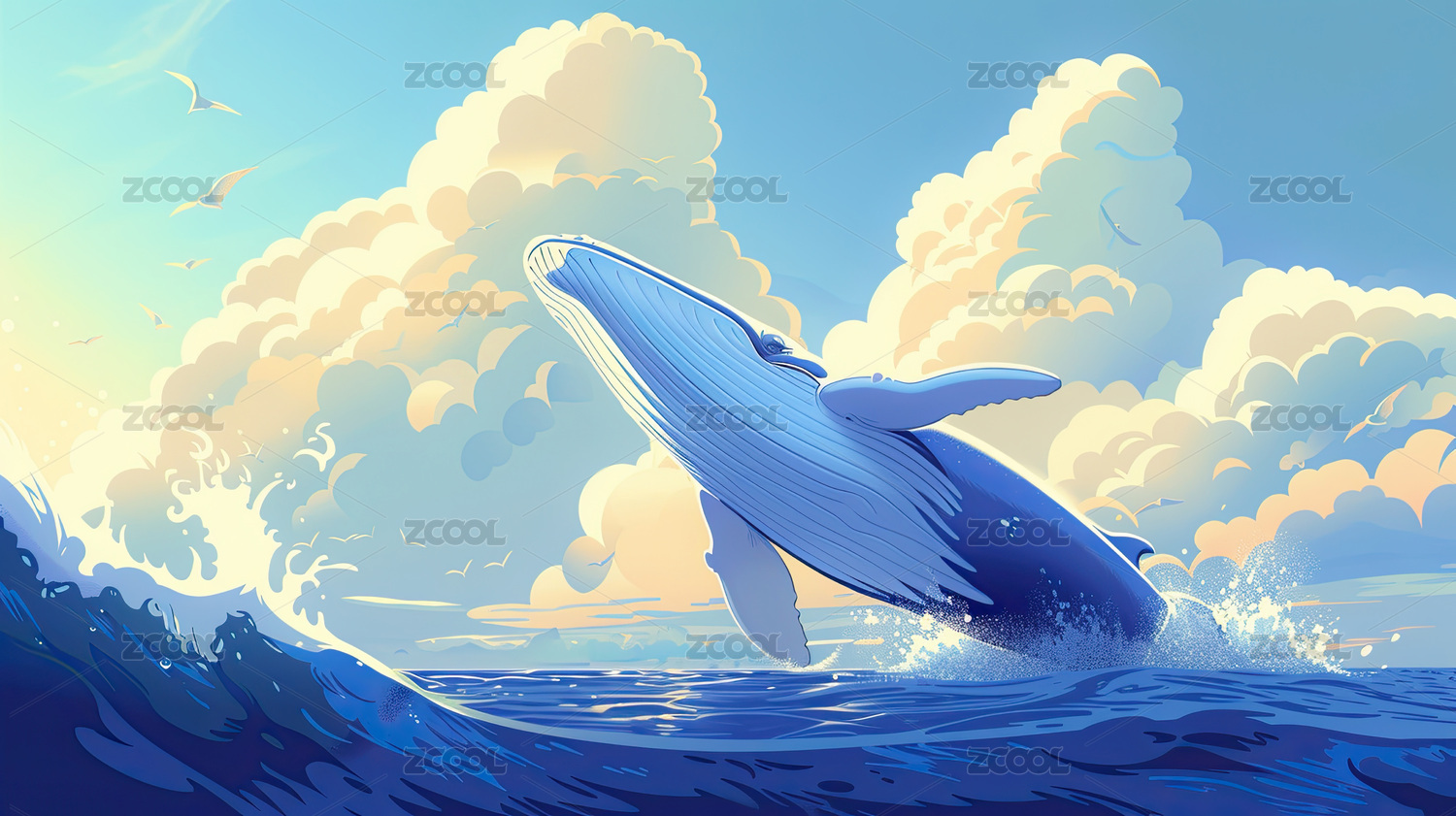 海洋,动物,自然,生态,艺术,插画,卡通,蓝色,水彩,天空
