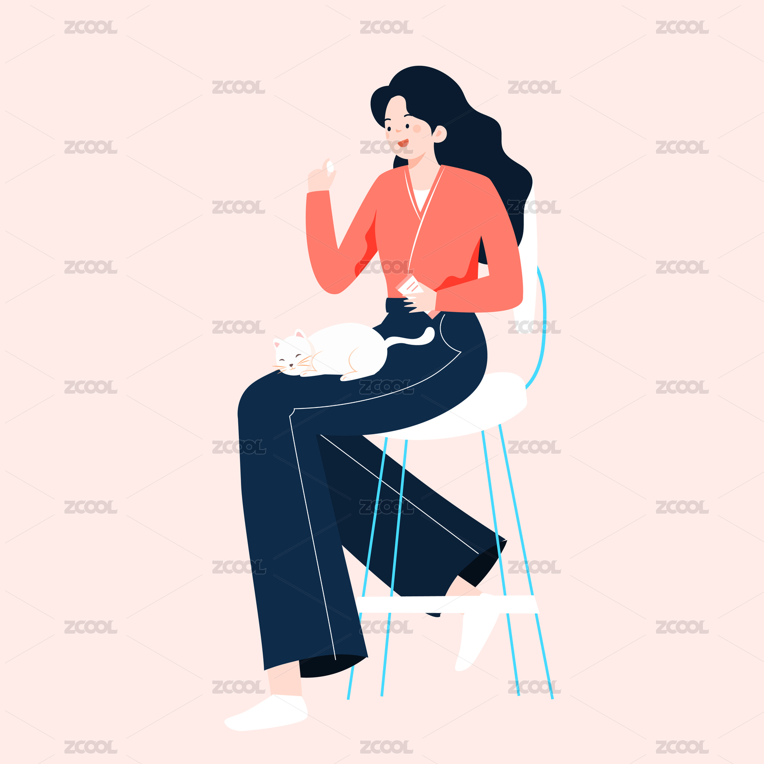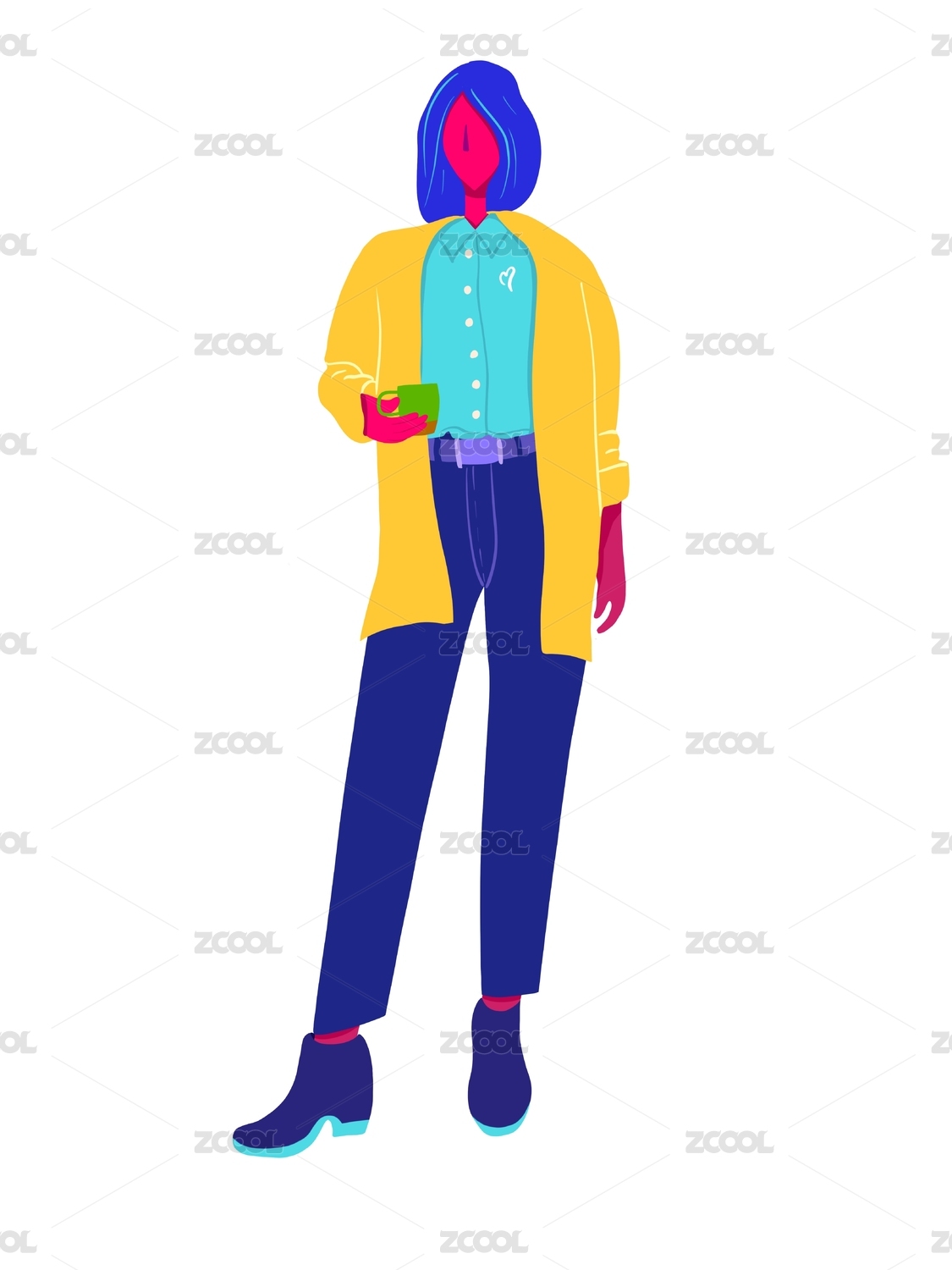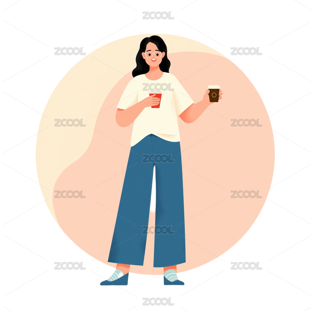 插画,女孩,愉悦,休闲,扁平,咖啡,时尚,蓝色,牛仔裤,站立