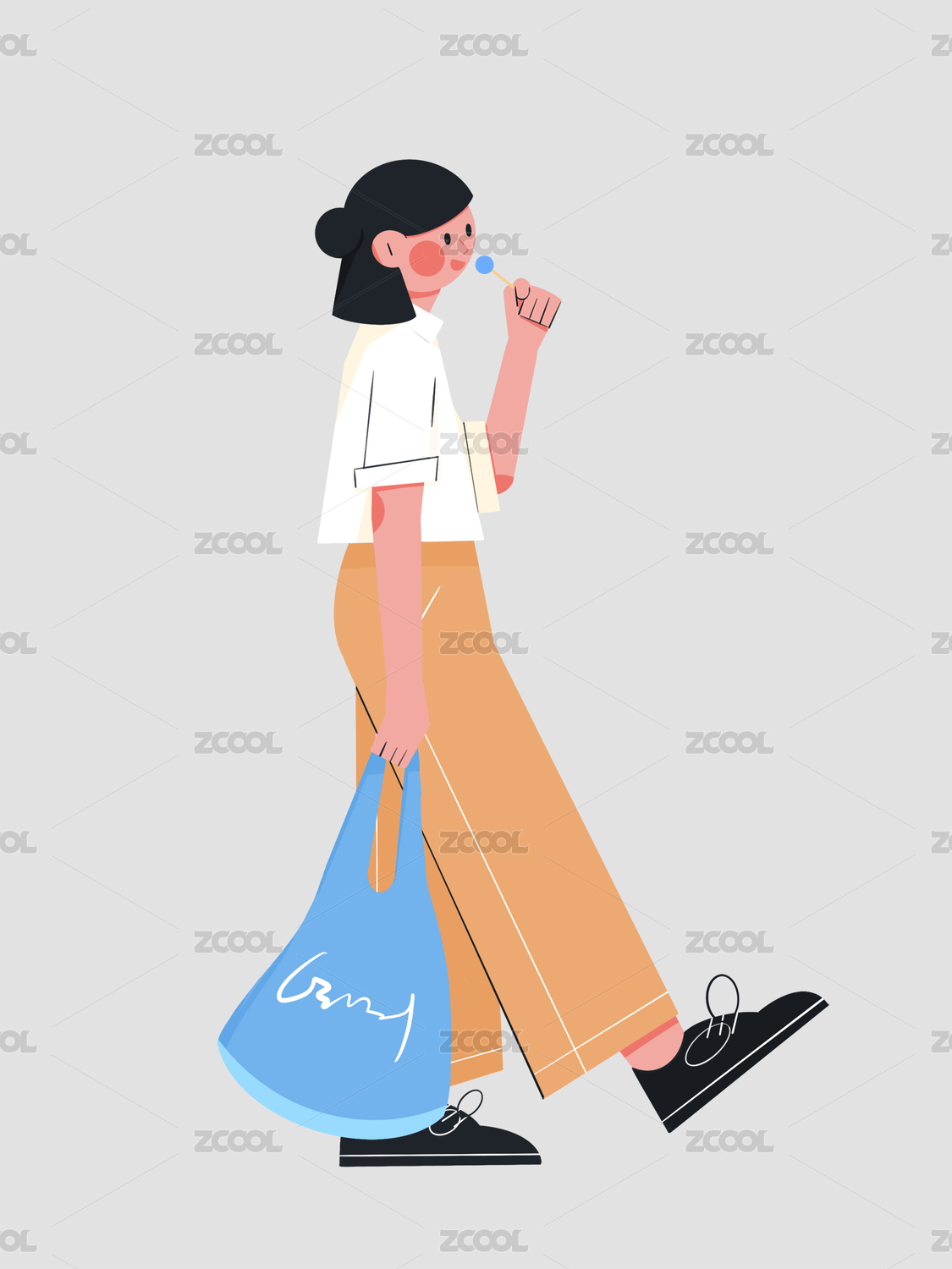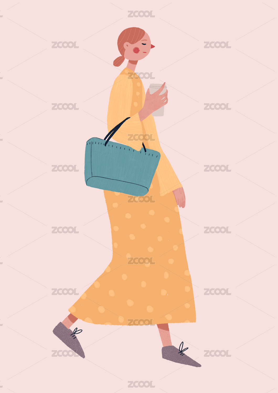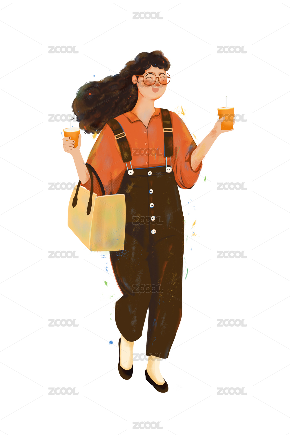 拿咖啡背斜挎包长卷发的时尚女孩插画
