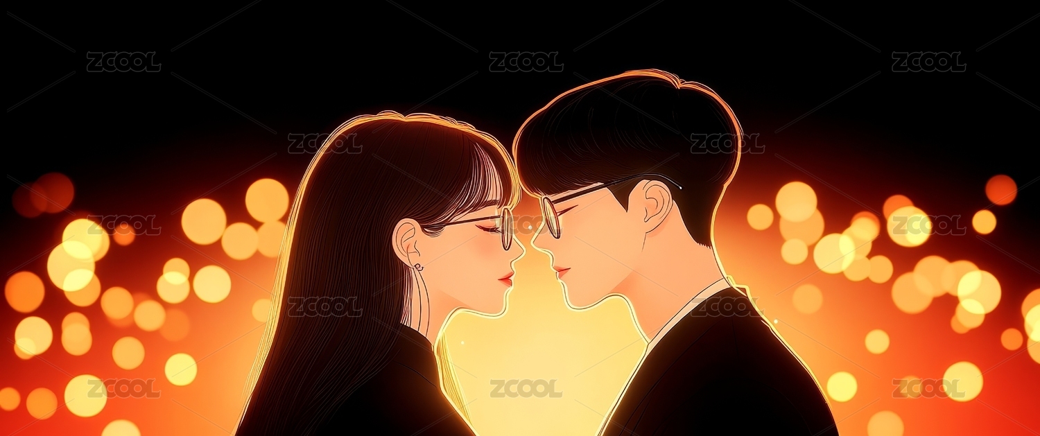 浪漫情侣的甜蜜对视心动瞬间的唯美定格插画