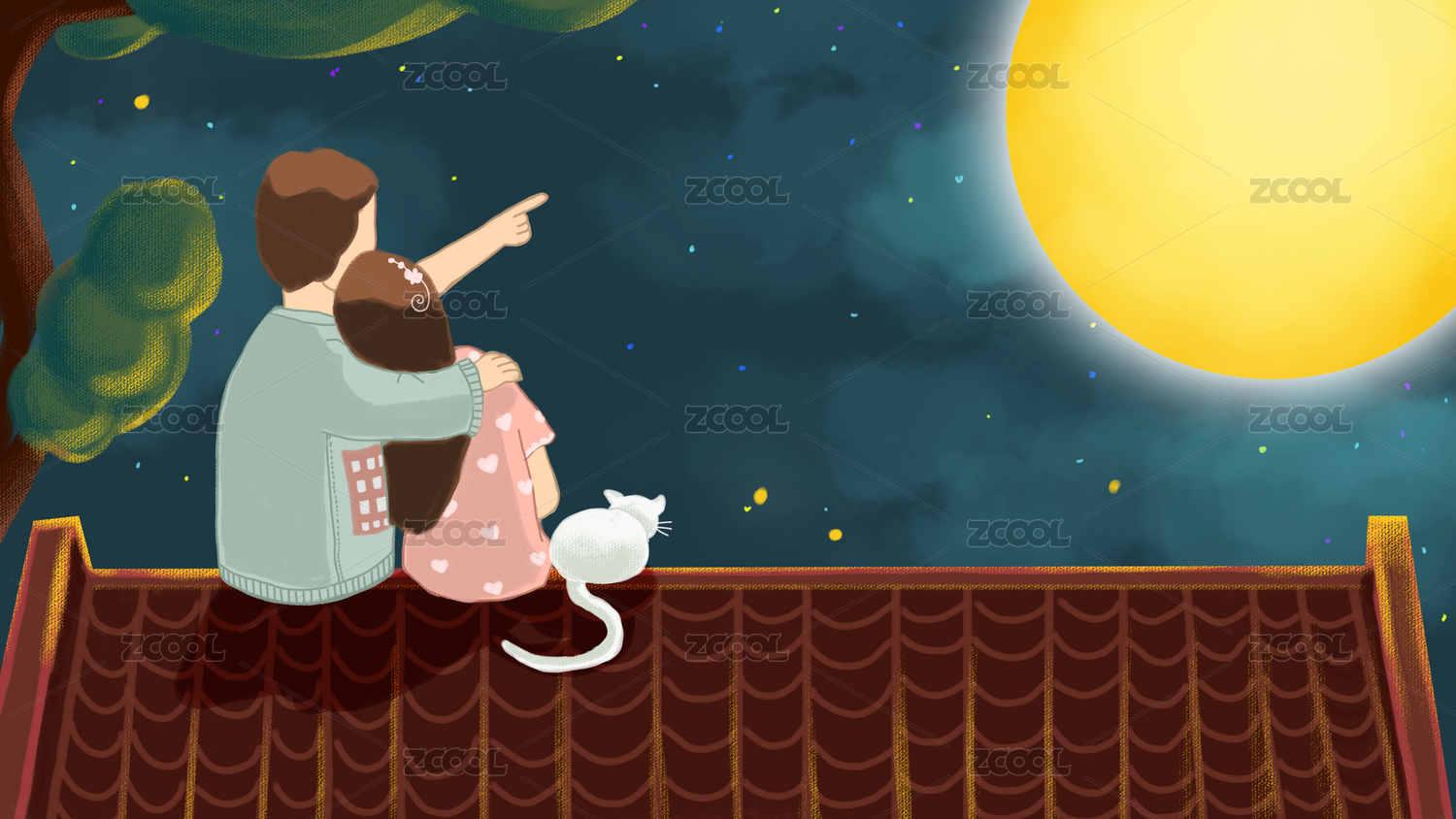 中秋节满月赏月屋顶小清新情侣猫咪团圆插画