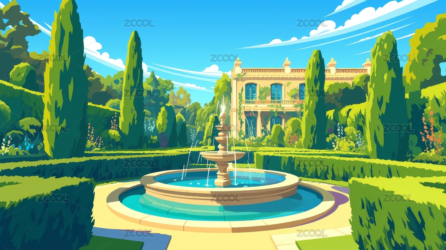 复古清新明亮有喷泉的欧式庭院3D立体插画