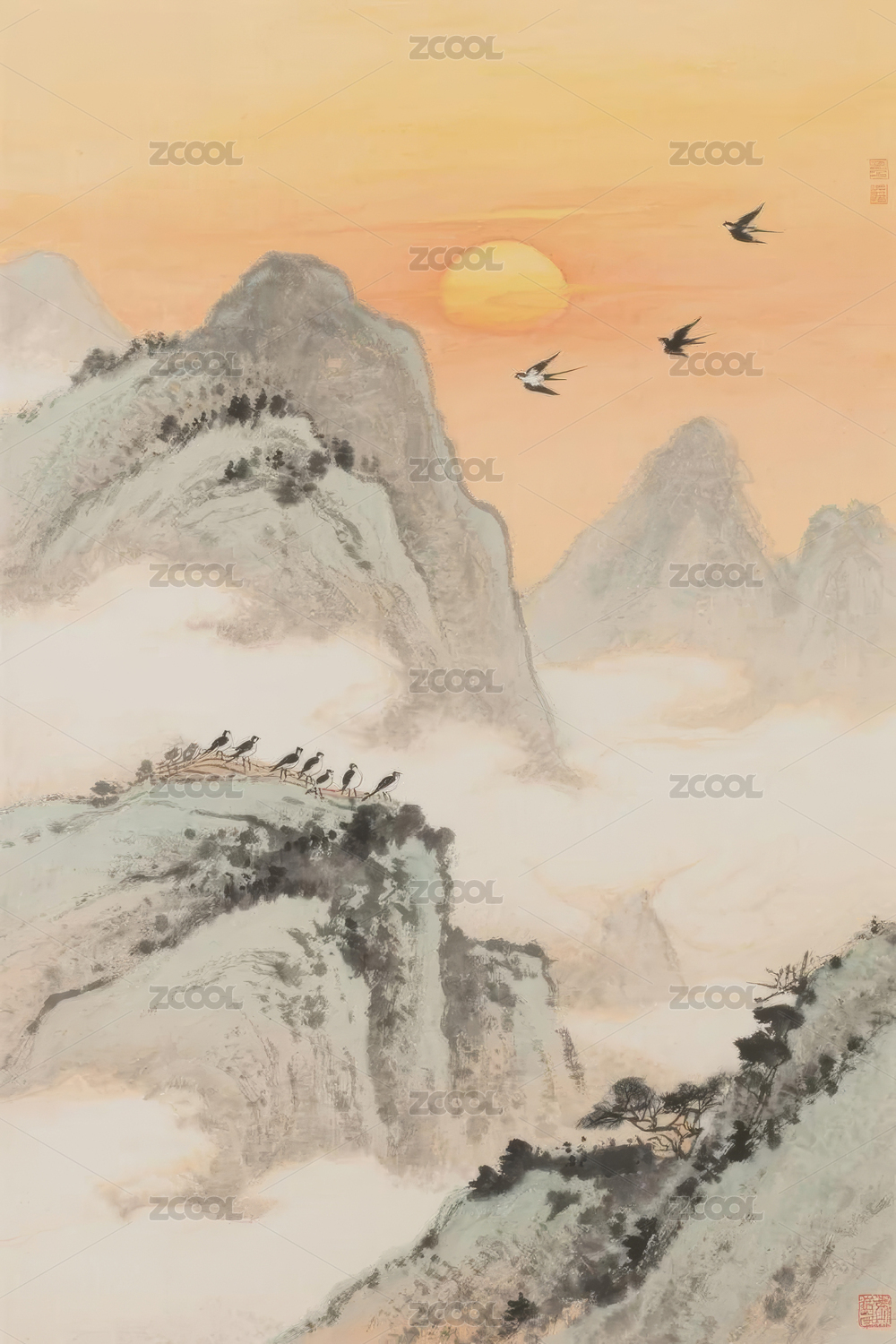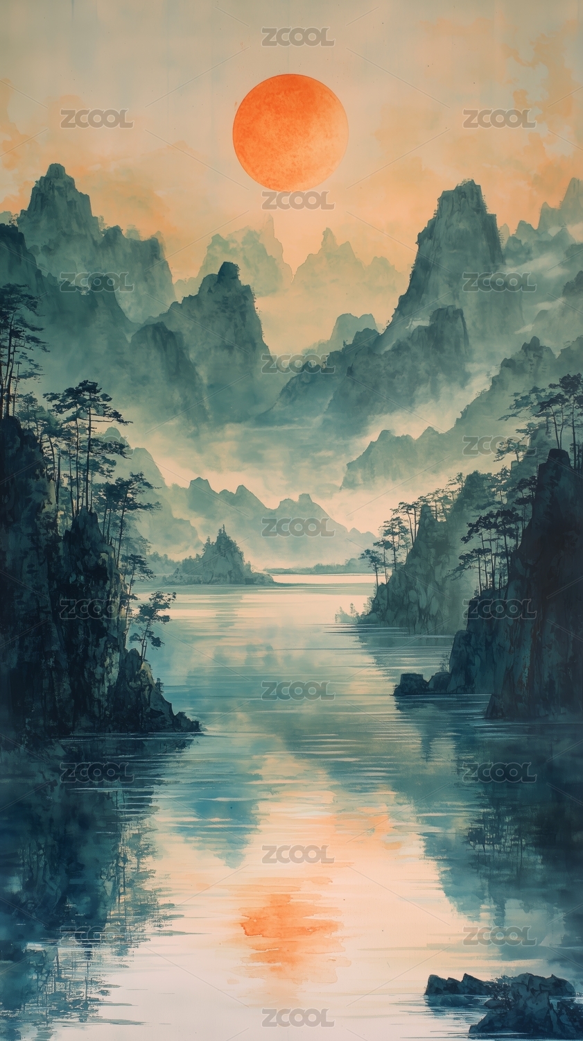 山峰,湖泊,平静,自然,风景,意境,宁静,水彩,日落,油画