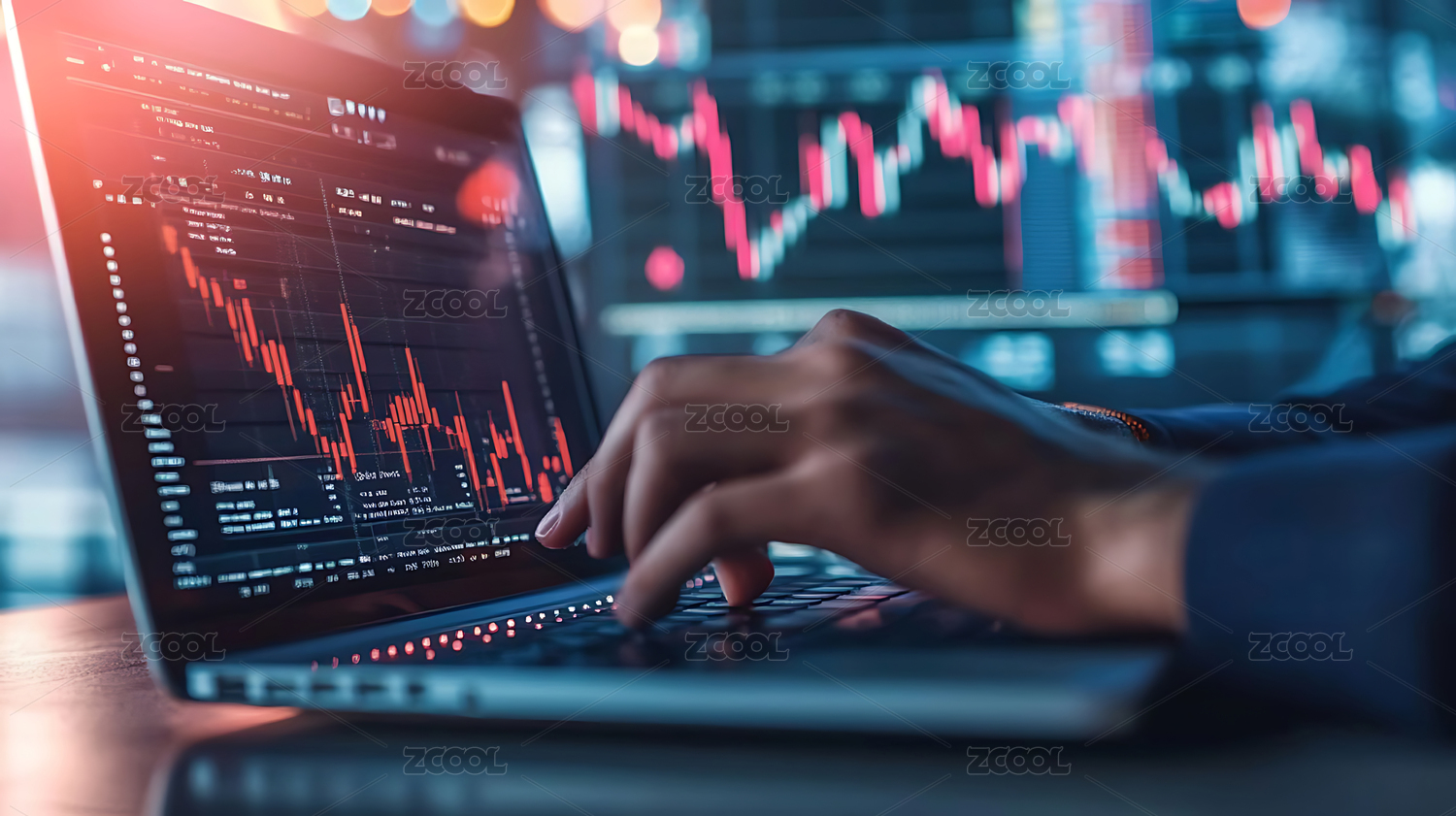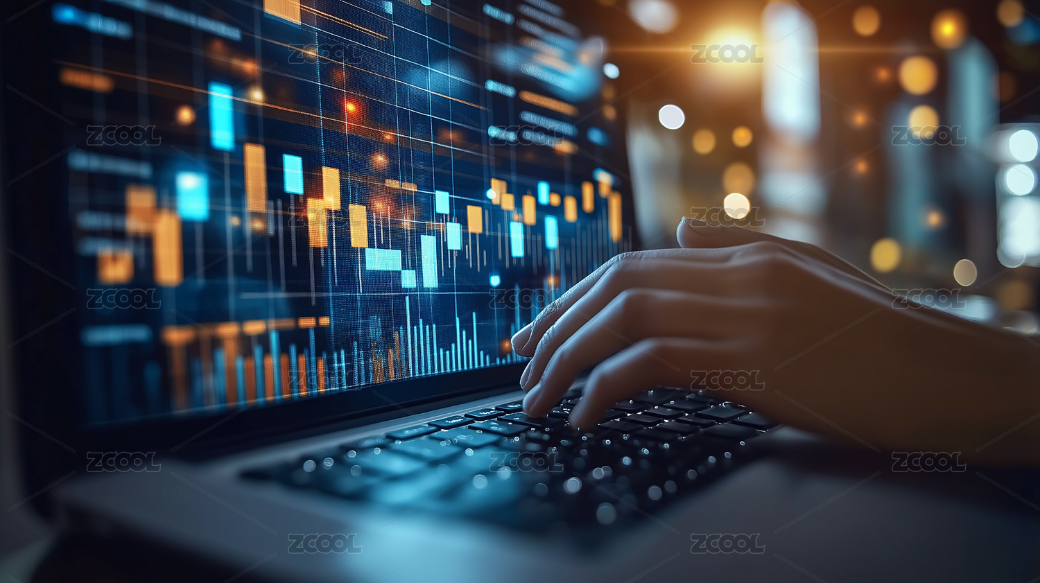 电脑屏幕显示股票图表手在键盘上操作