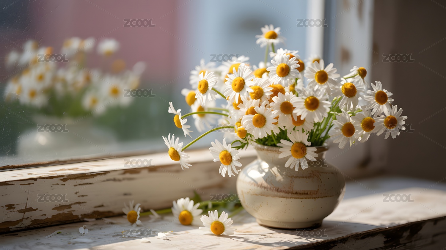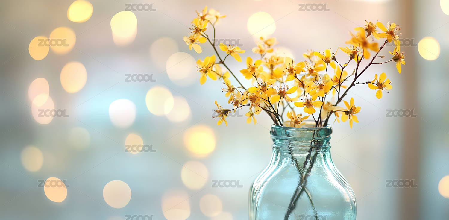 秋季深秋阳台上摆放着玻璃瓶里的金色花朵
