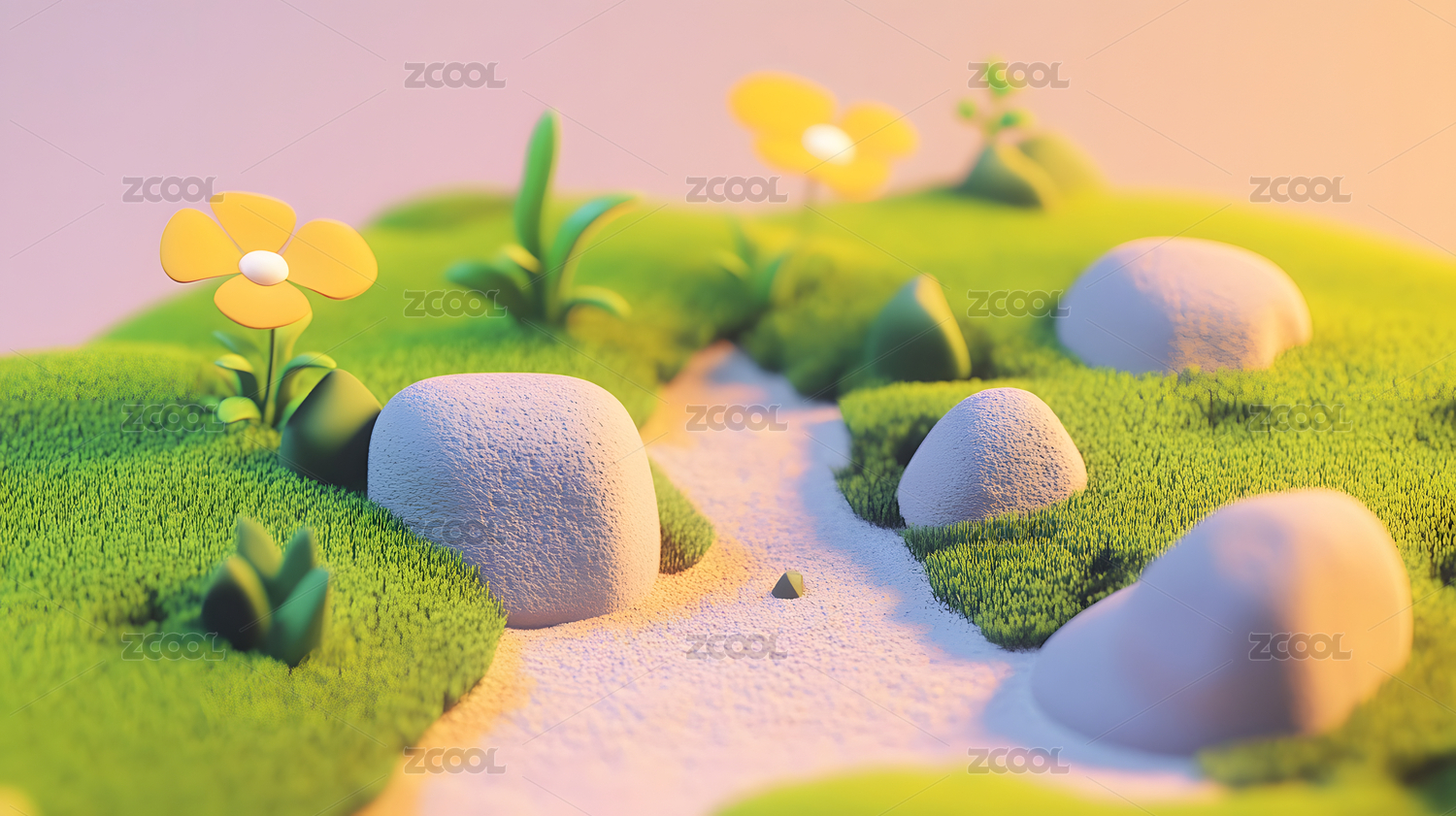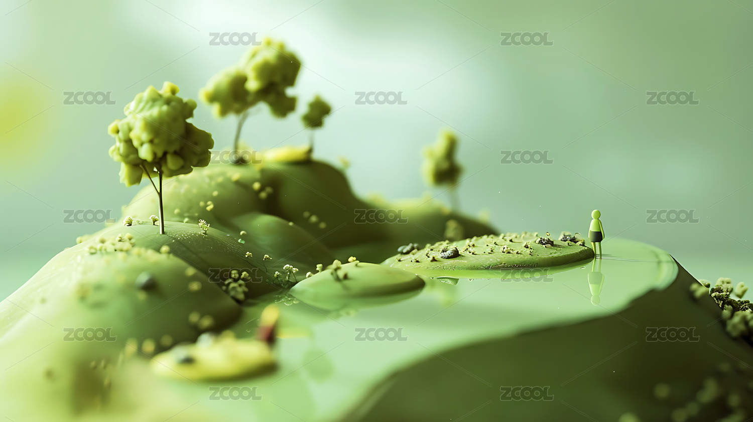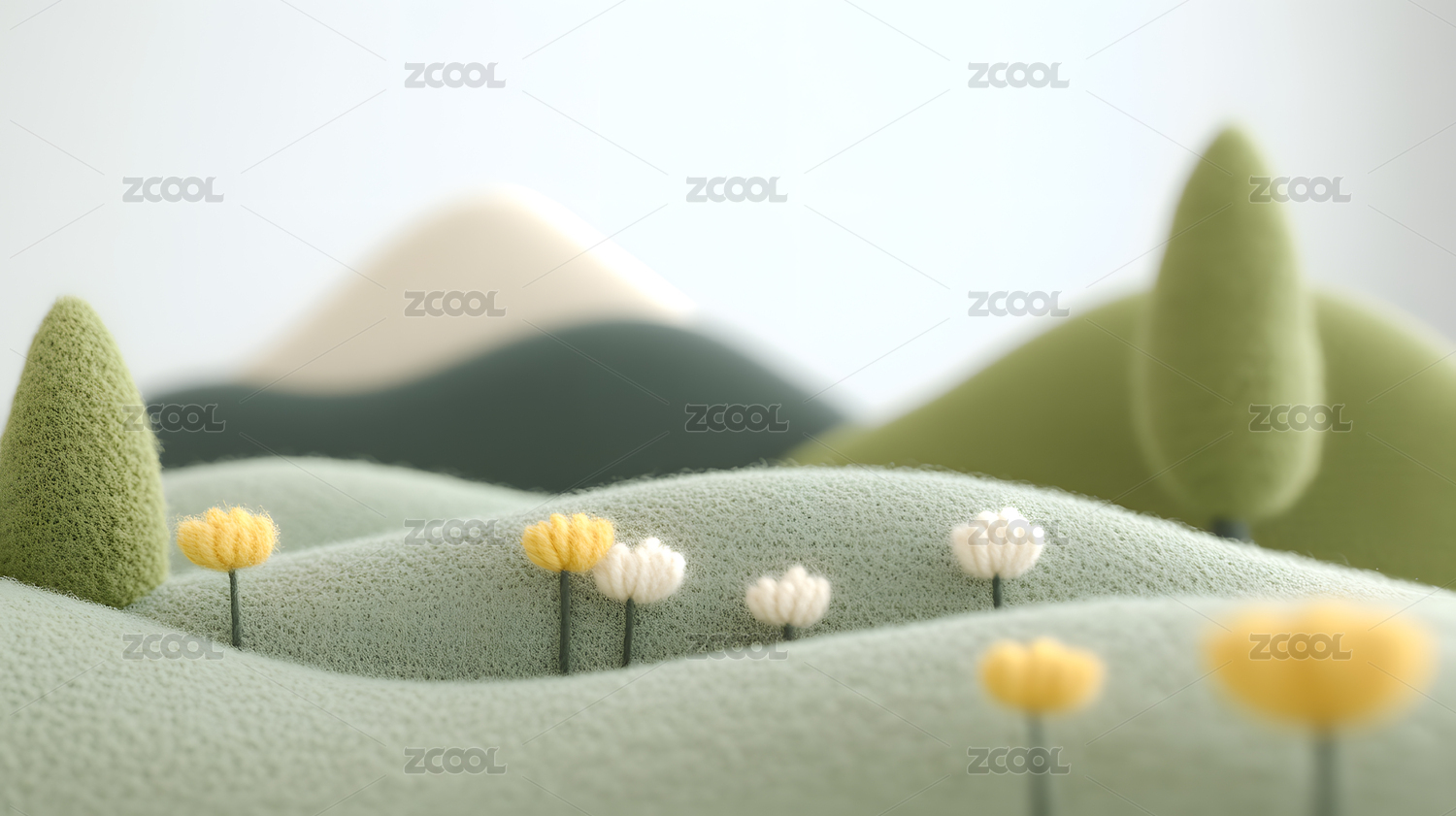 绿色羊毛毡毛绒毛线田野3D卡通立体插画