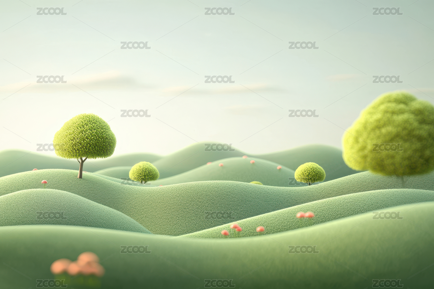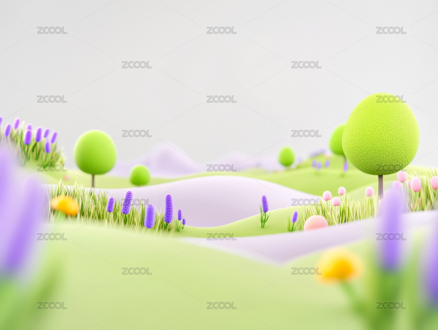 绿色,草地,蓝色,花朵,小山丘,自然,清新,春天,卡通,风格