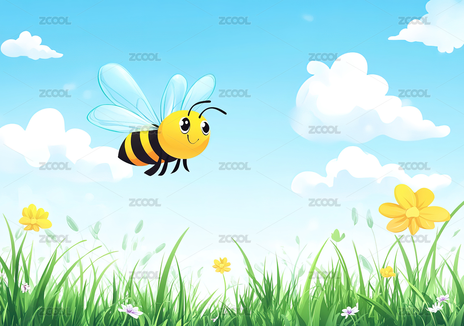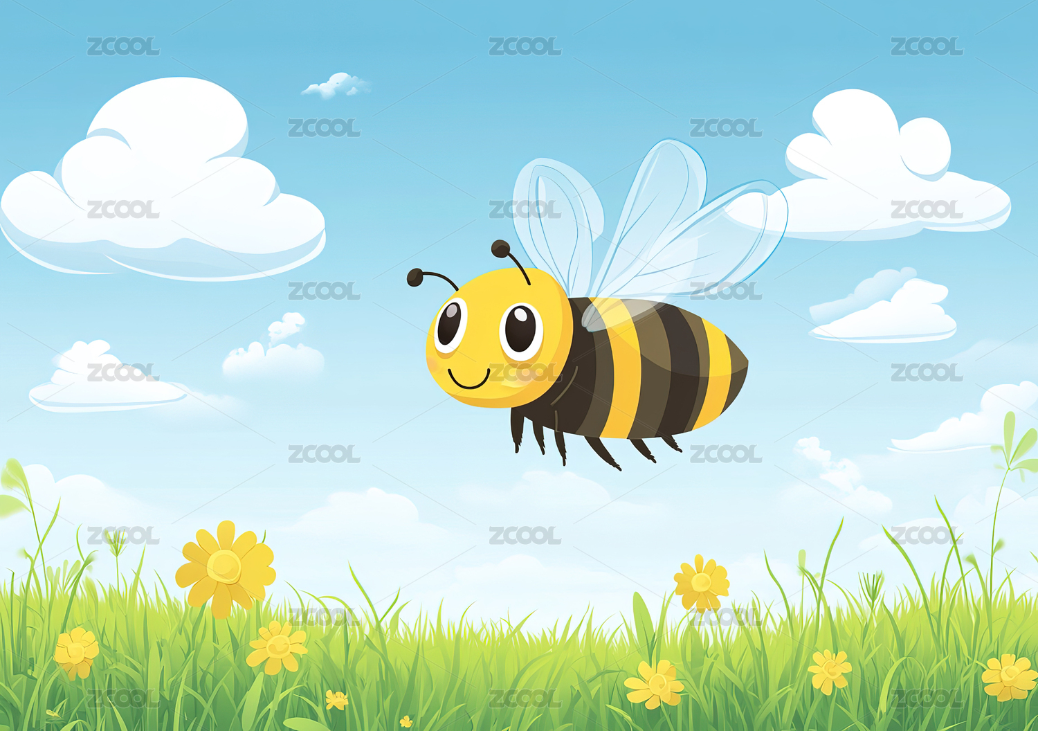 蜜蜂,花丛,草地,花朵,黄色,卡通,可爱,自然,春天