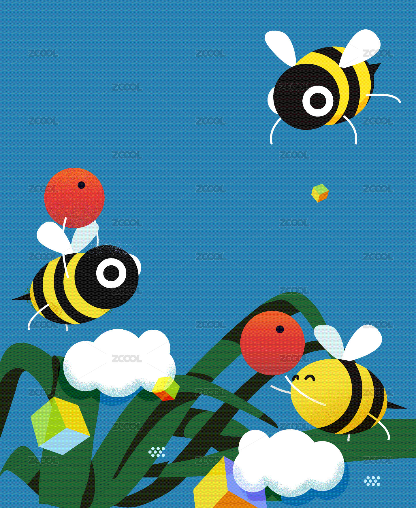 蓝天白云绿植中追逐的蜜蜂和萤火虫矢量插画