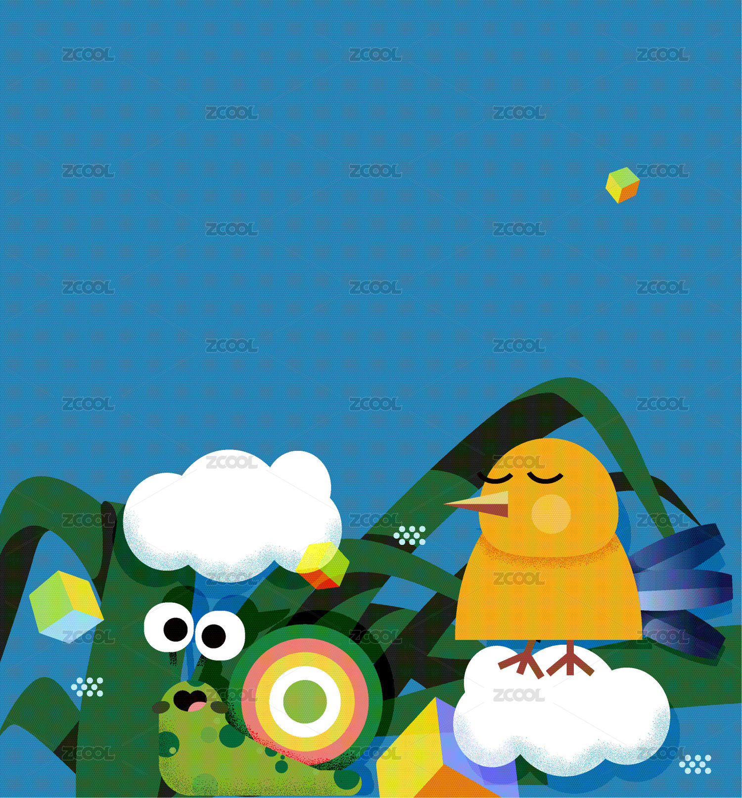 蓝天白云蜗牛绿植清新矢量插画
