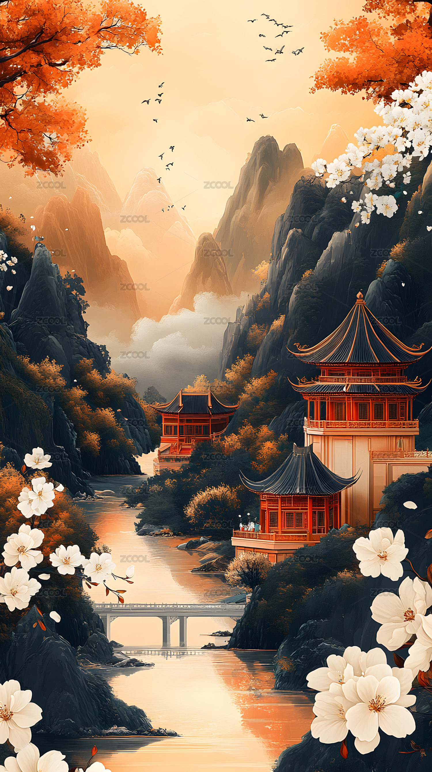 深秋远山瀑布中式风景插画素材海报