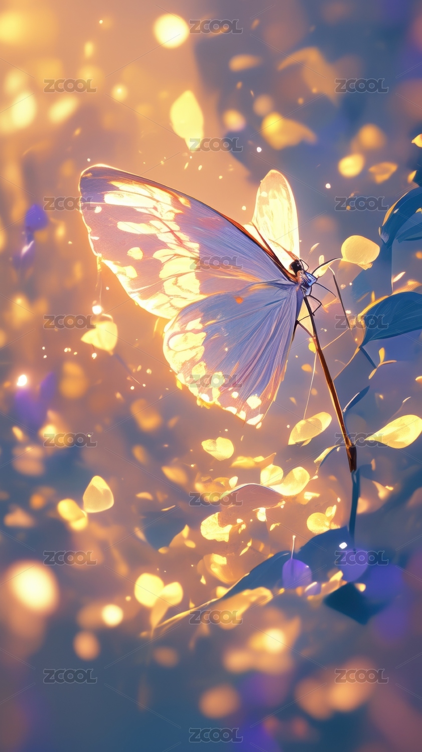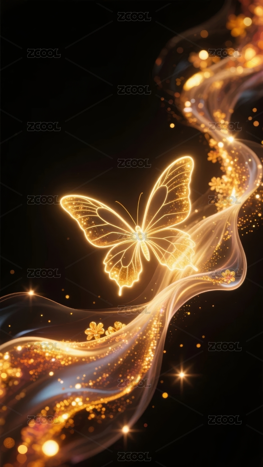 金色蝴蝶翩翩起舞周围环绕着光芒与花朵