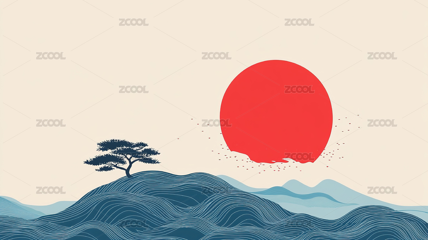 红日,松树,云海,山峦,线条,古风,轮廓,古朴,云纹,灵动