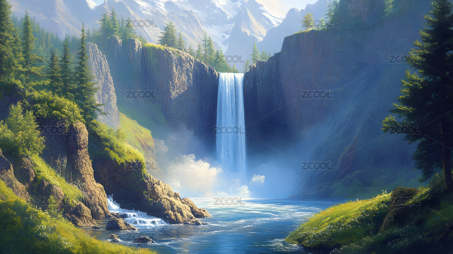 瀑布彩虹高山流水奇幻超现实大场景唯美创意