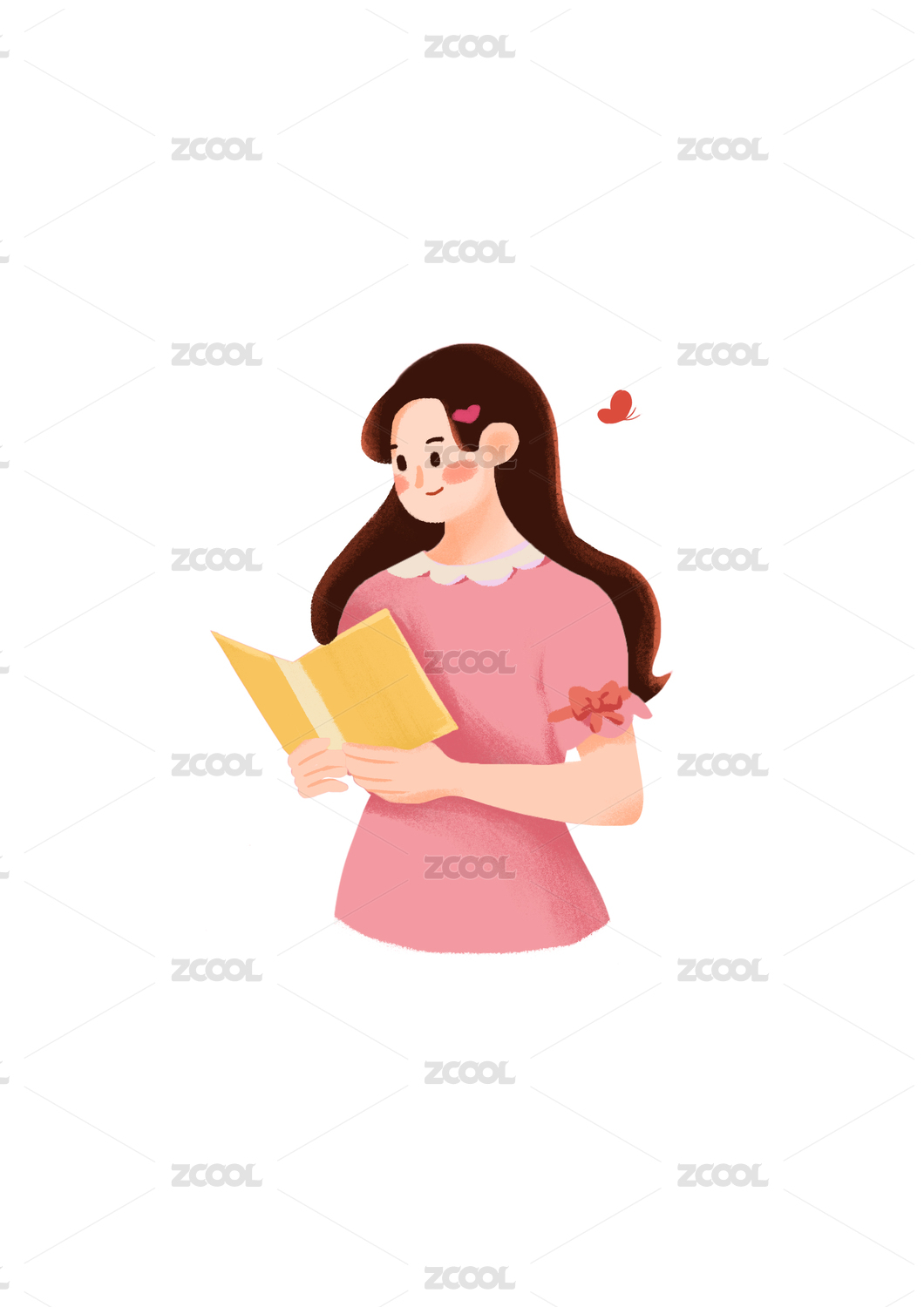 粉色小清新看书女生插画