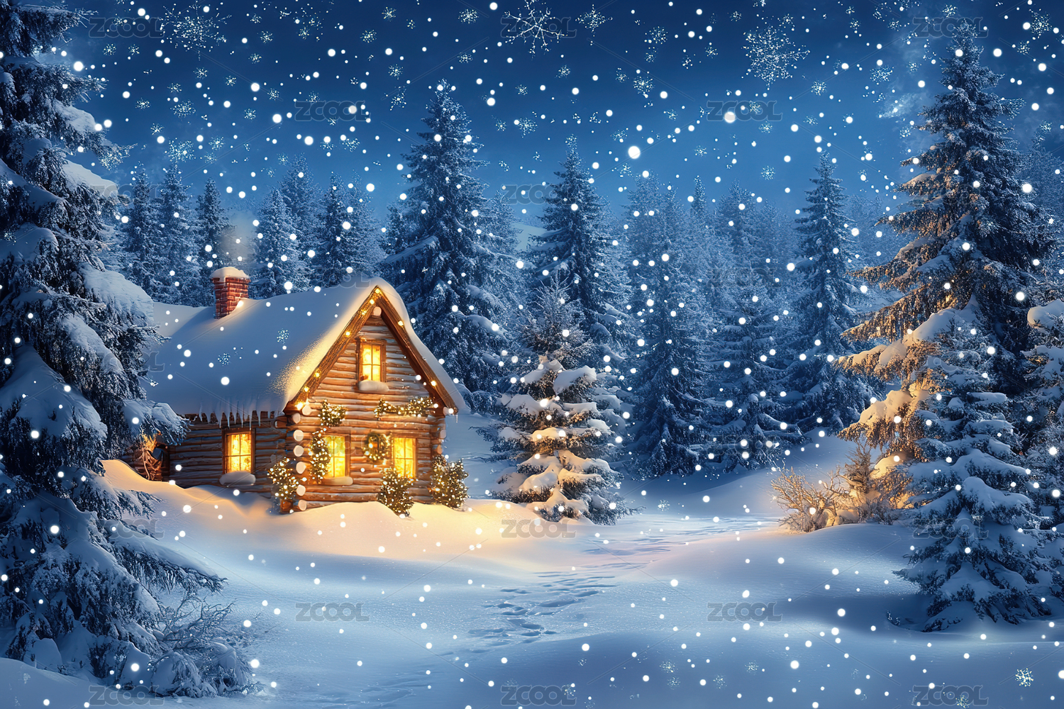 雪夜森林中的温暖小屋