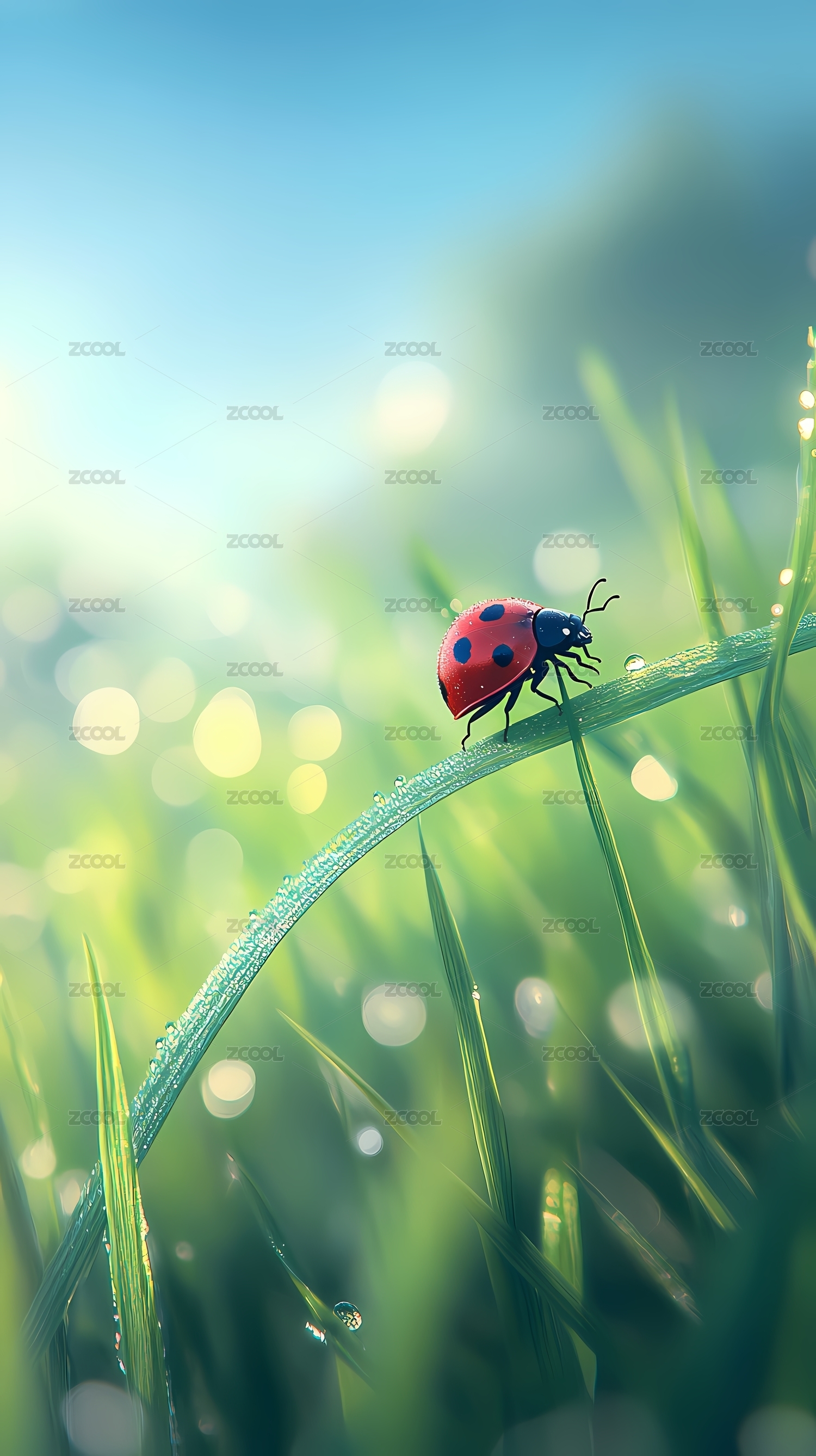 草尖上的瓢虫与晶莹露珠