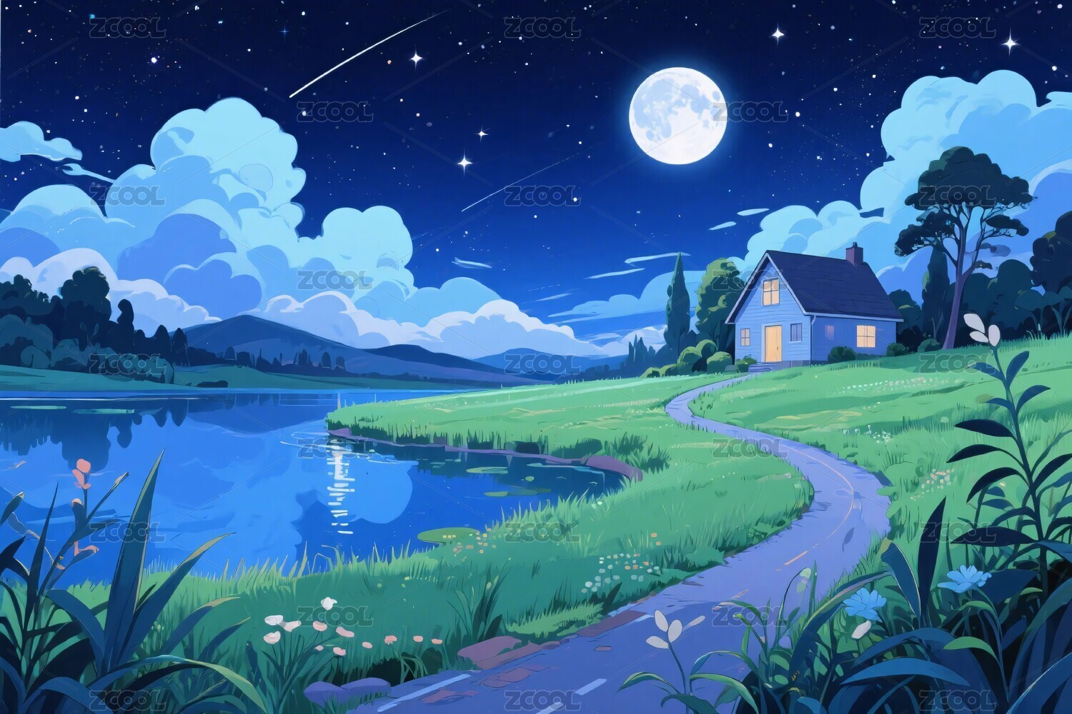 湖畔小屋夜色幽静