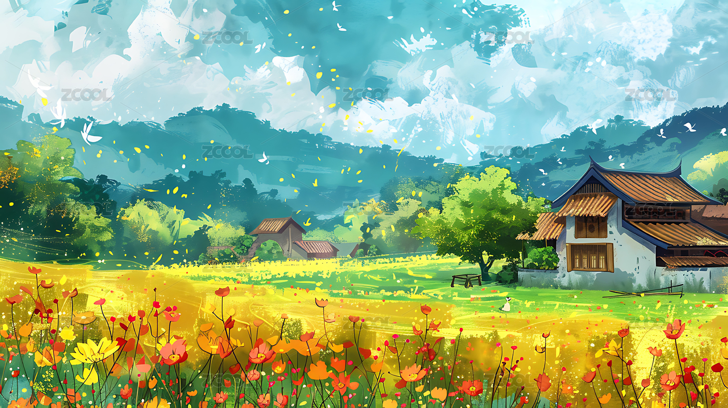 夏天户外旅行山峰房屋乡村风景蓝天白云插画