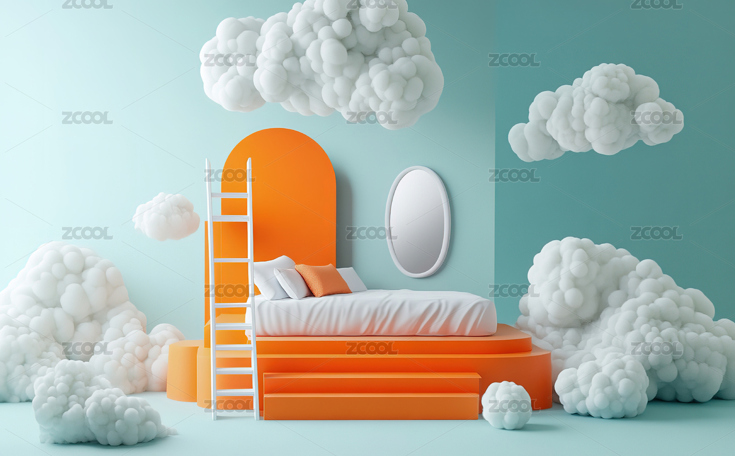 创意,温馨,三维,立体,3D,渲染,背景,床,粉色,云朵