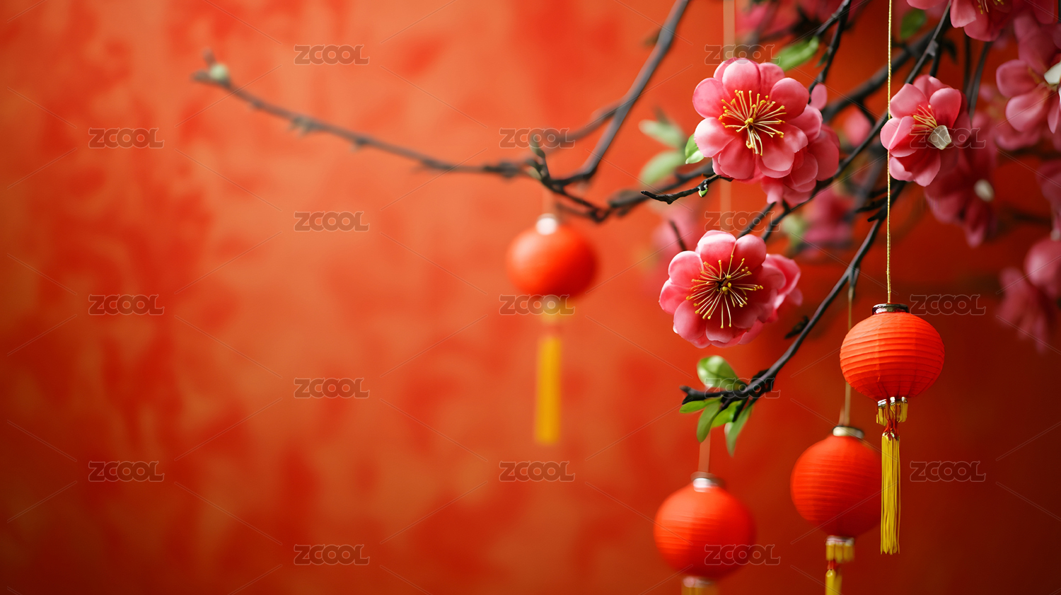 红墙前的梅花与灯笼的节日装饰