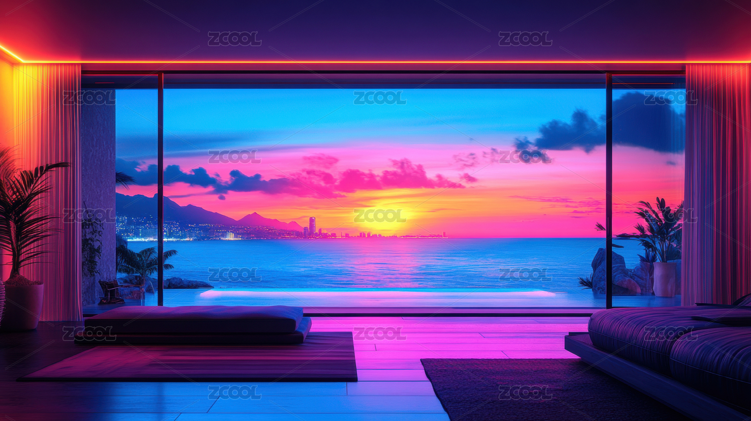 山景,湖光,窗户,秋色,雪山,木屋,床榻,茶具,自然,宁静