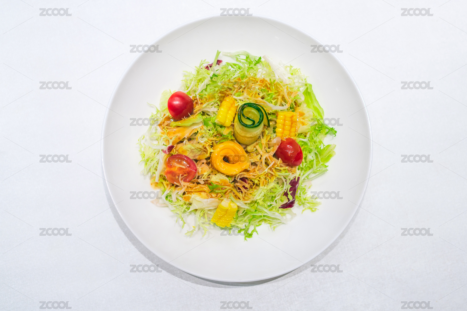 俯拍深蓝色背景上白色圆瓷盘中的蔬菜沙拉