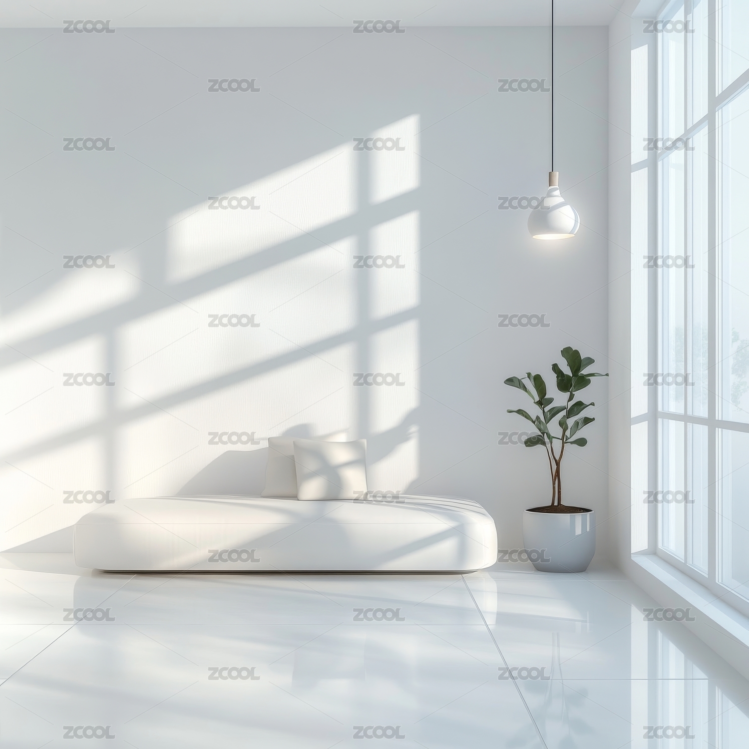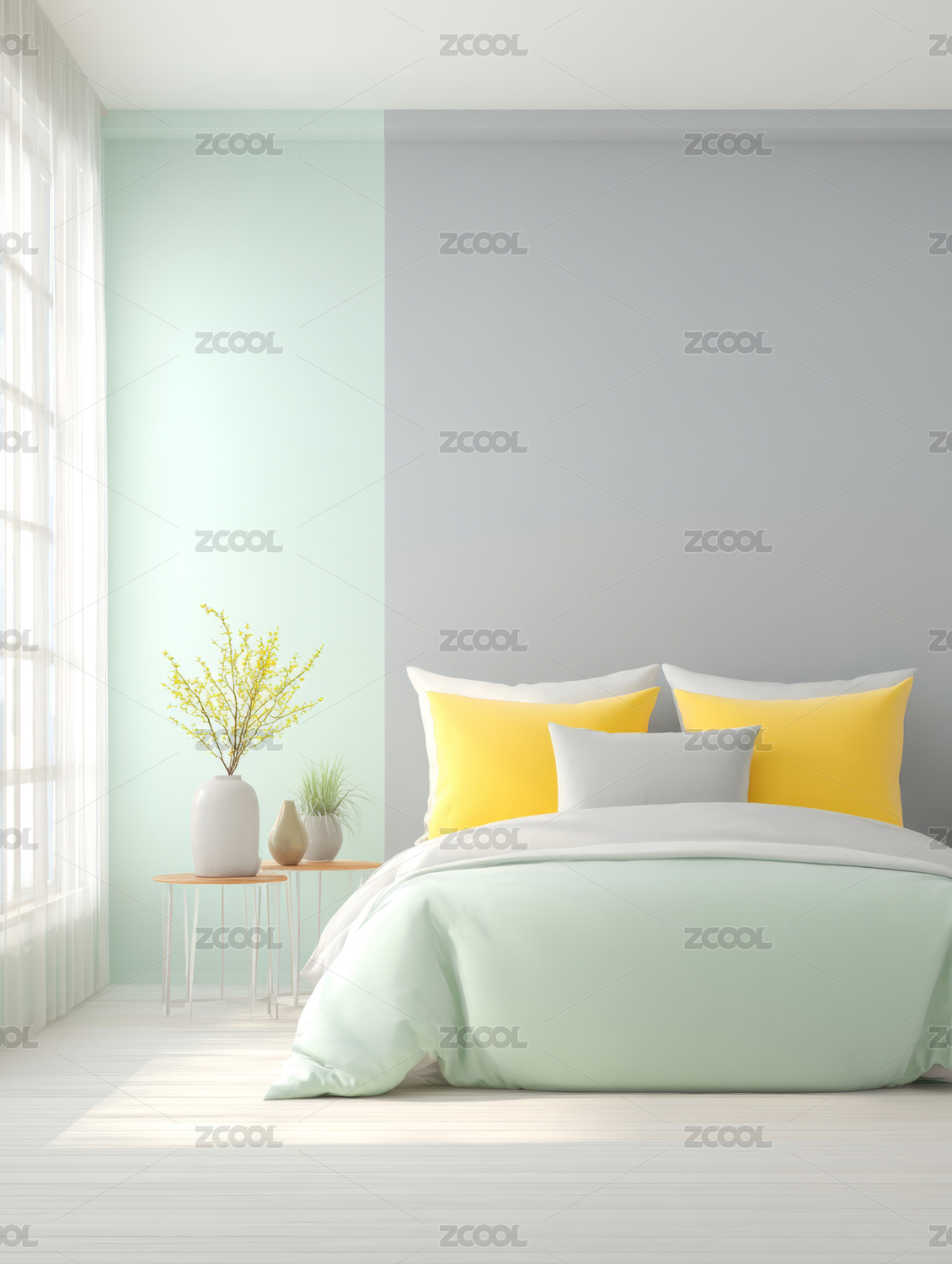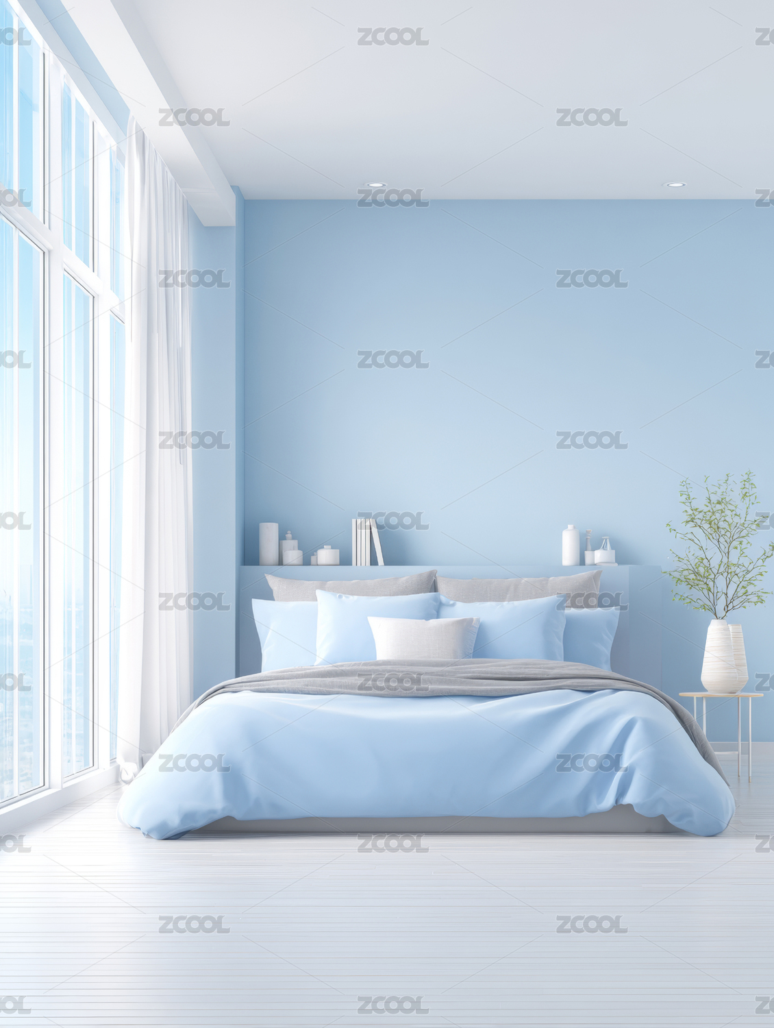 卧室,现代,简约,蓝色,床,植物,窗户,装饰画,吊灯