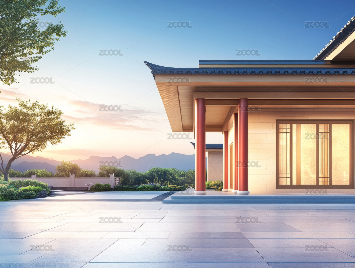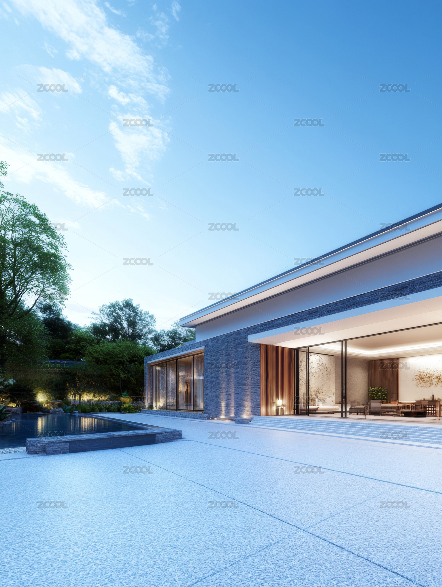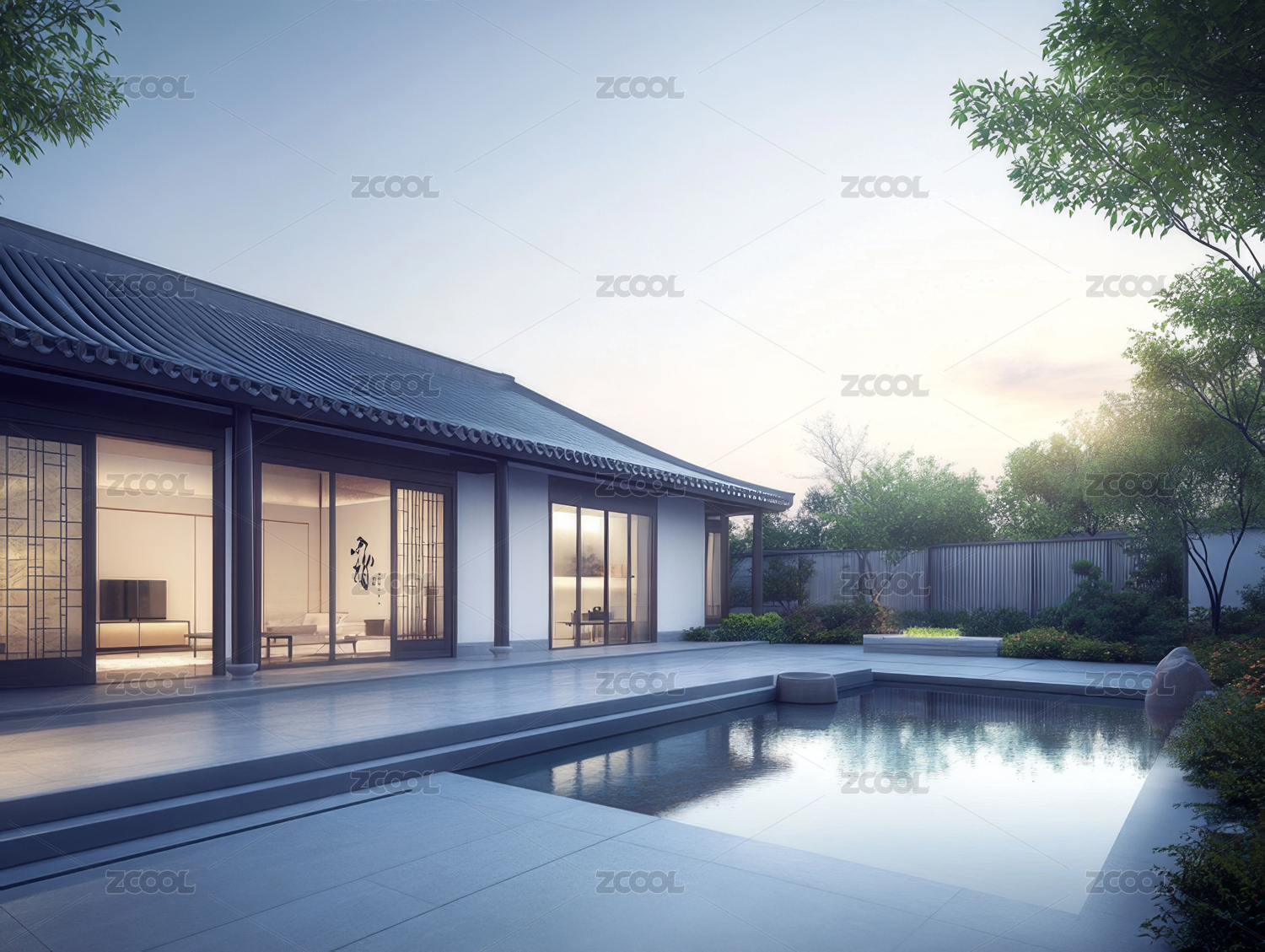 别墅,中式,建筑,庭院,游泳池,现代,设计,花园,夕阳,室外