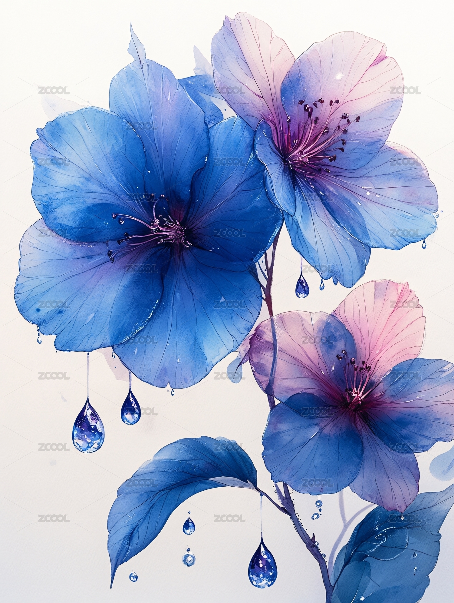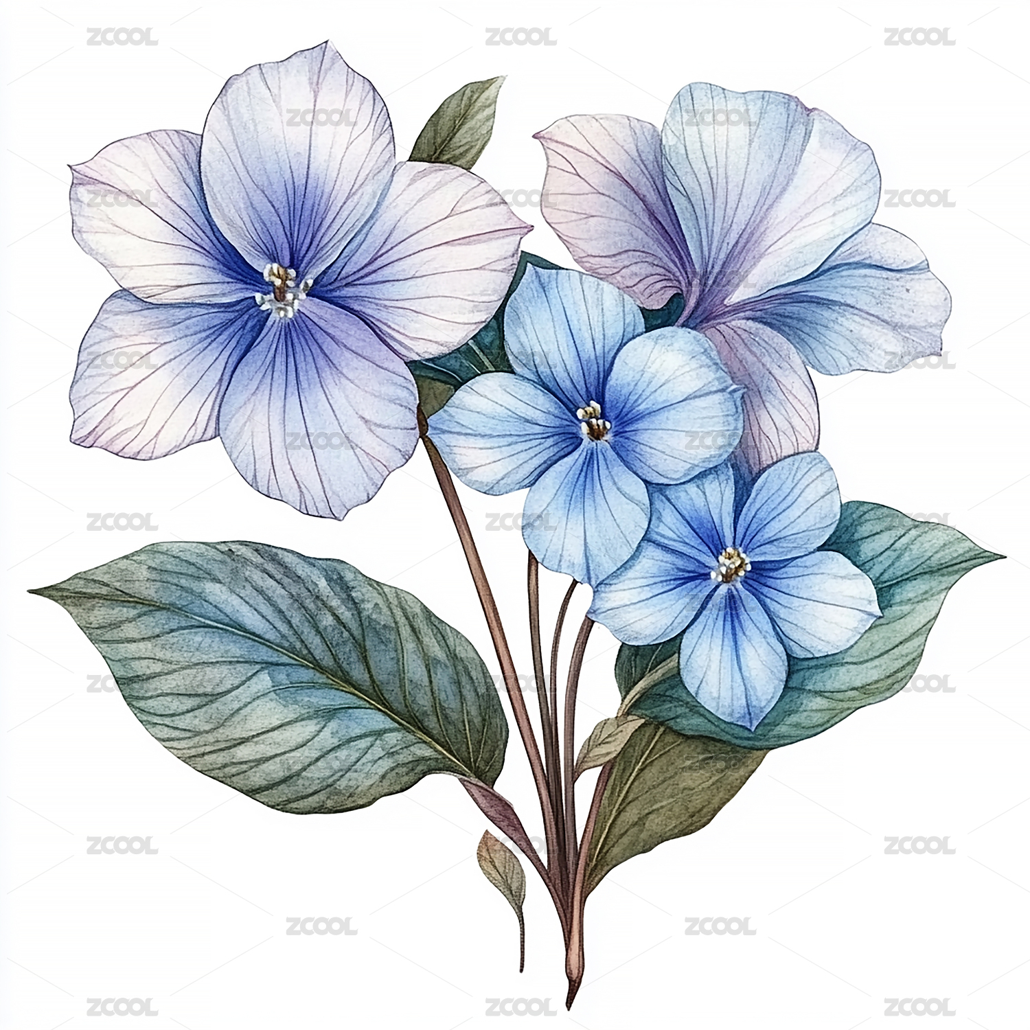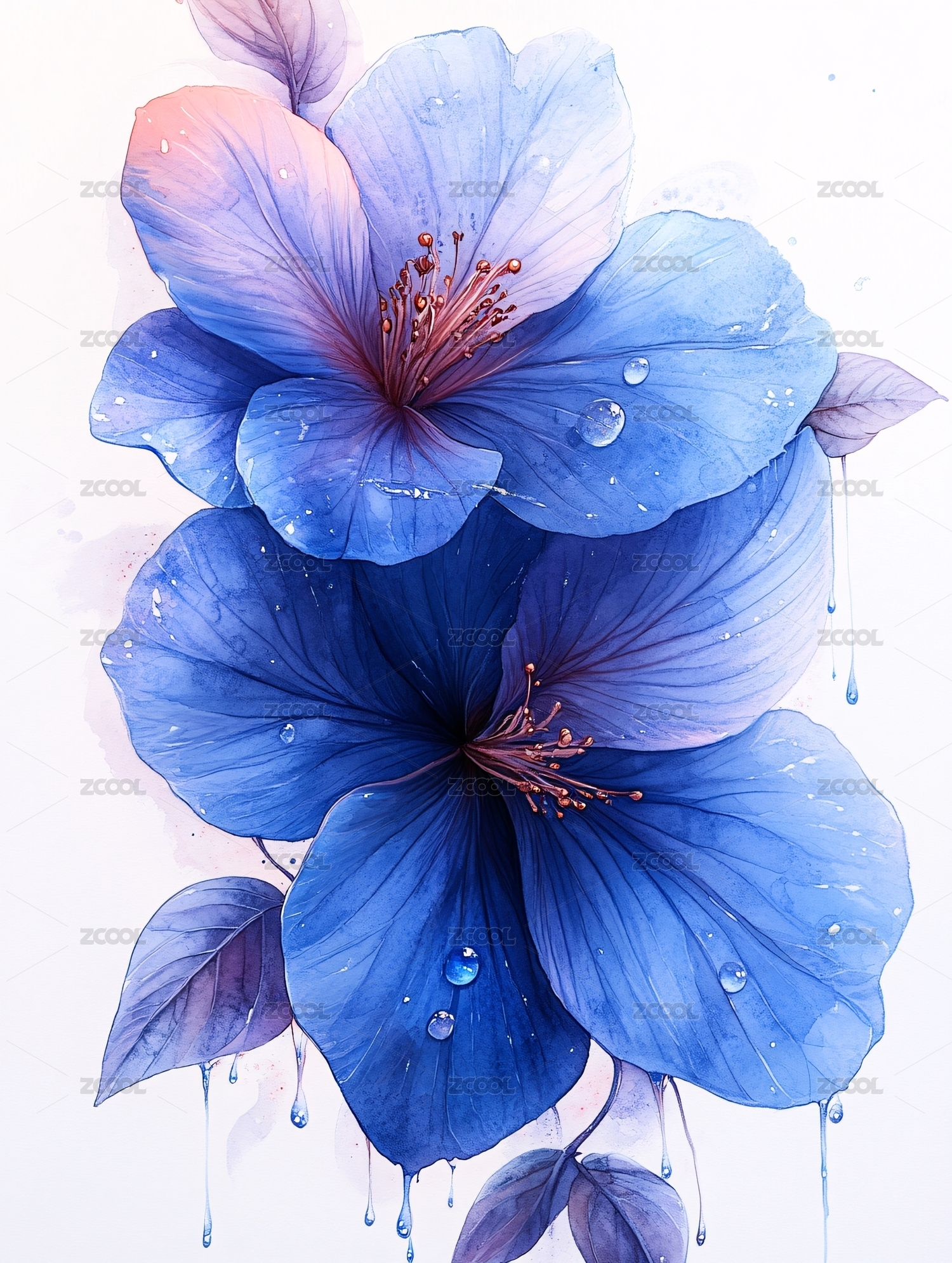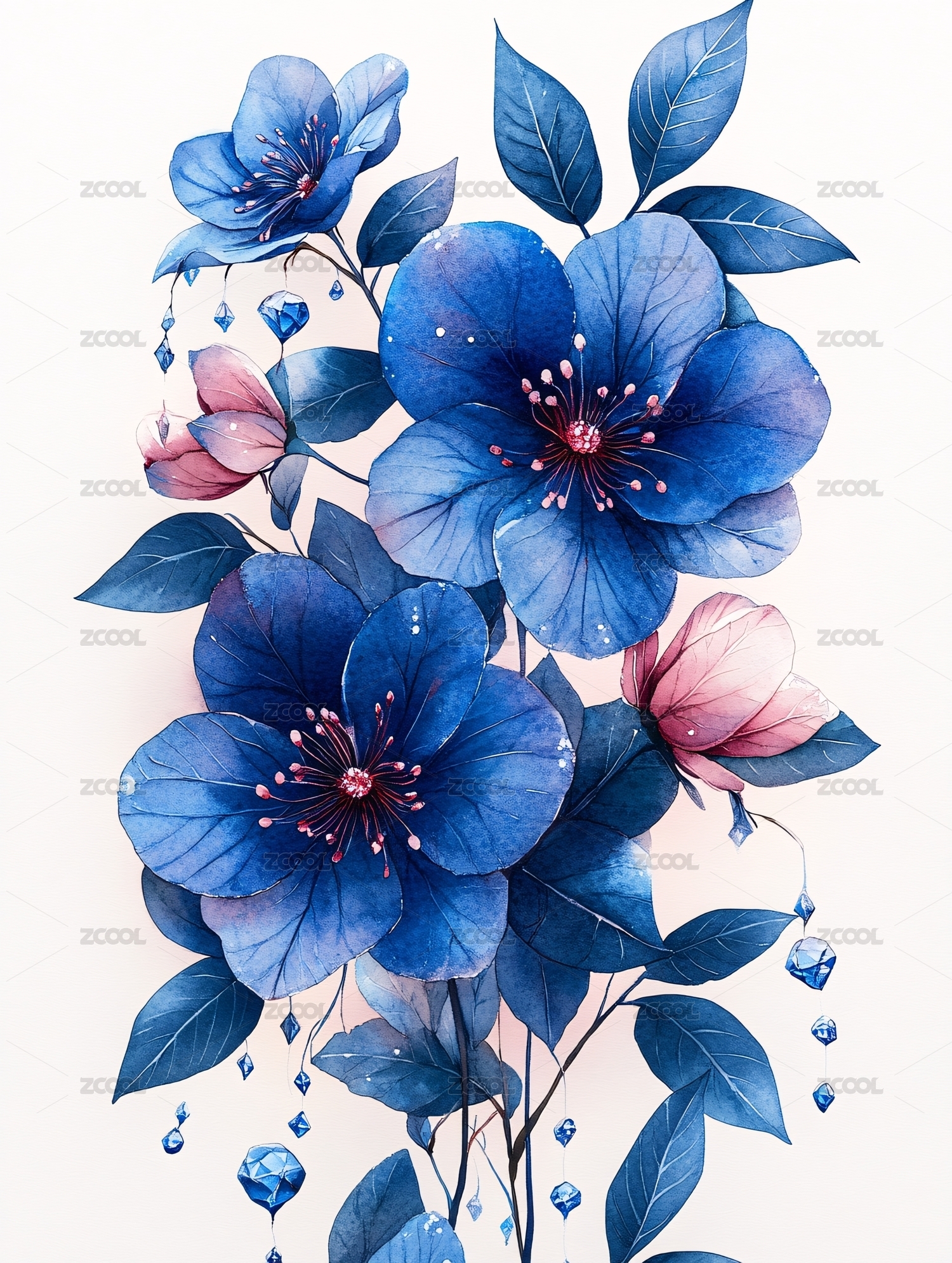 蓝粉花卉植物水彩插画