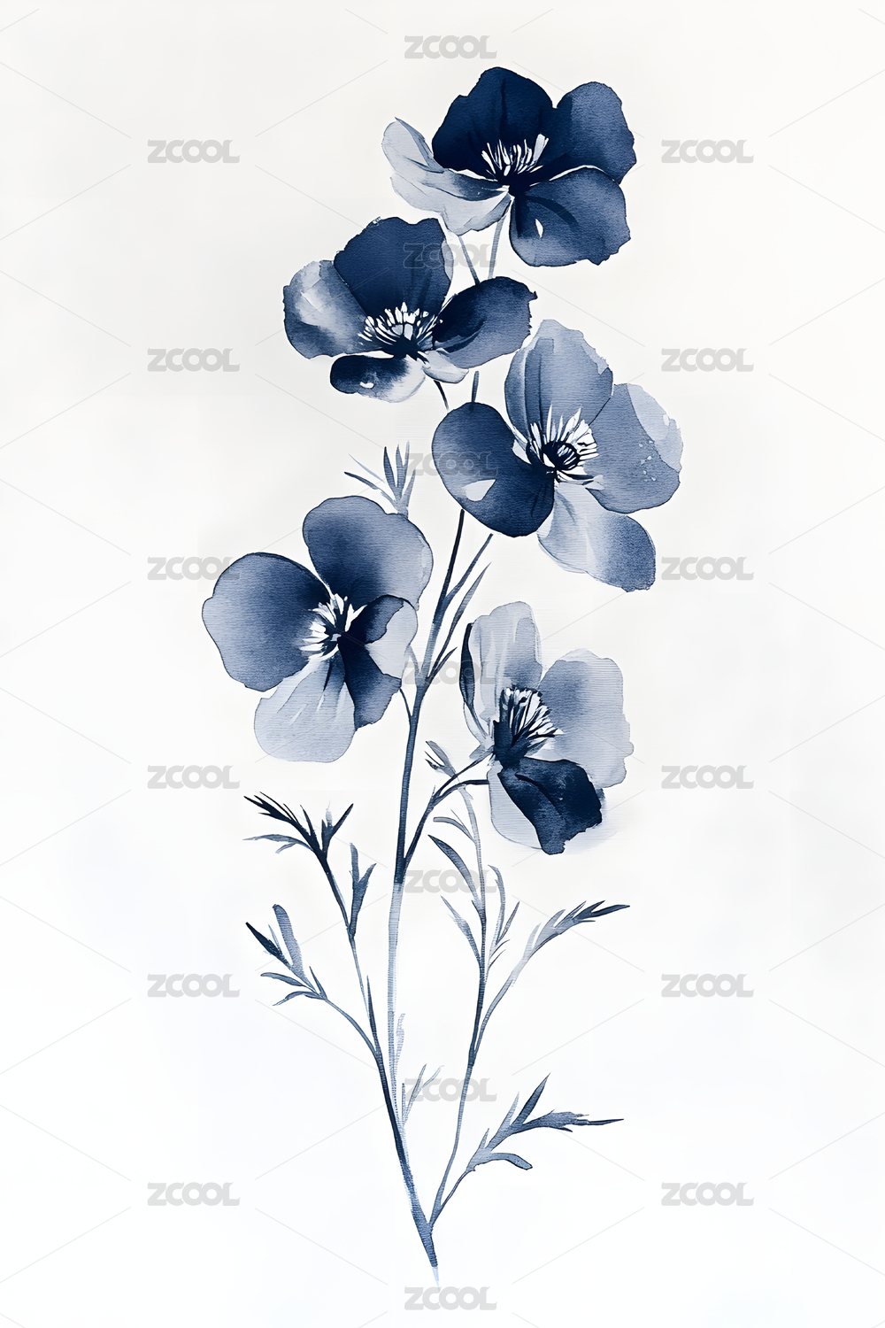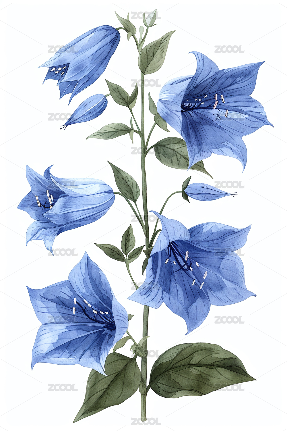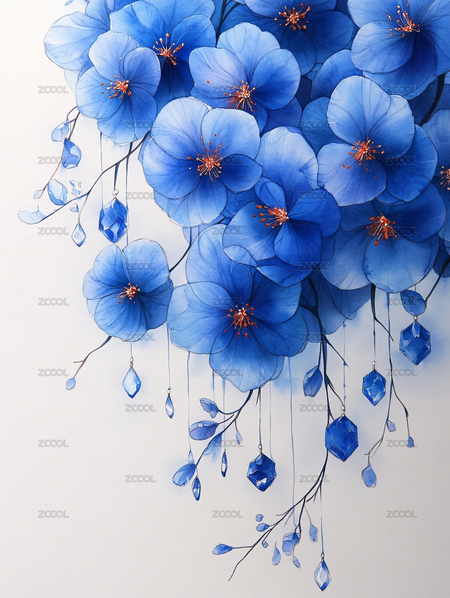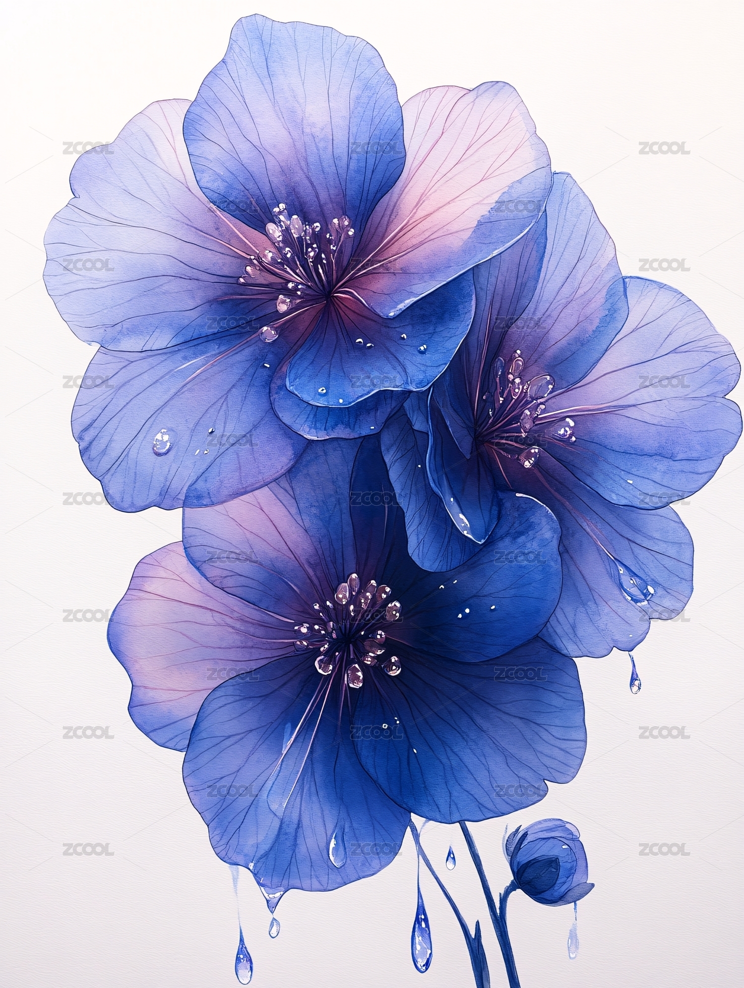蓝粉花卉植物水彩插画