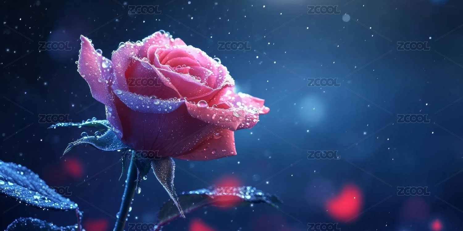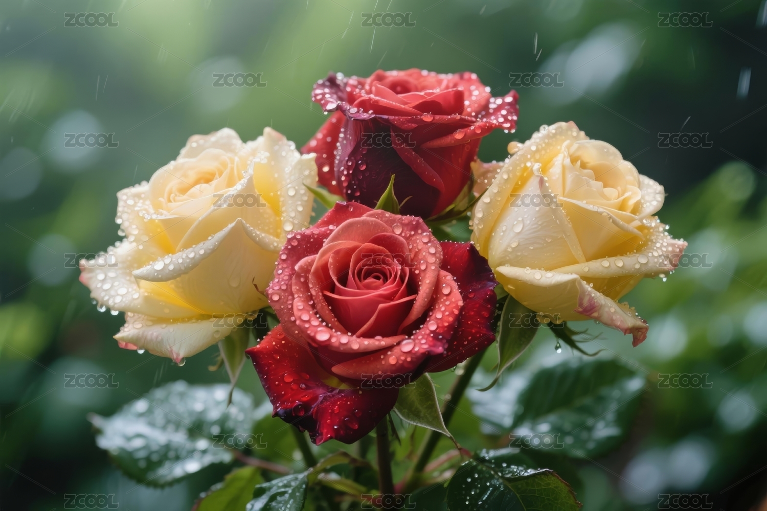 美丽的玫瑰在风中摇曳,雨滴落下并溅起水珠