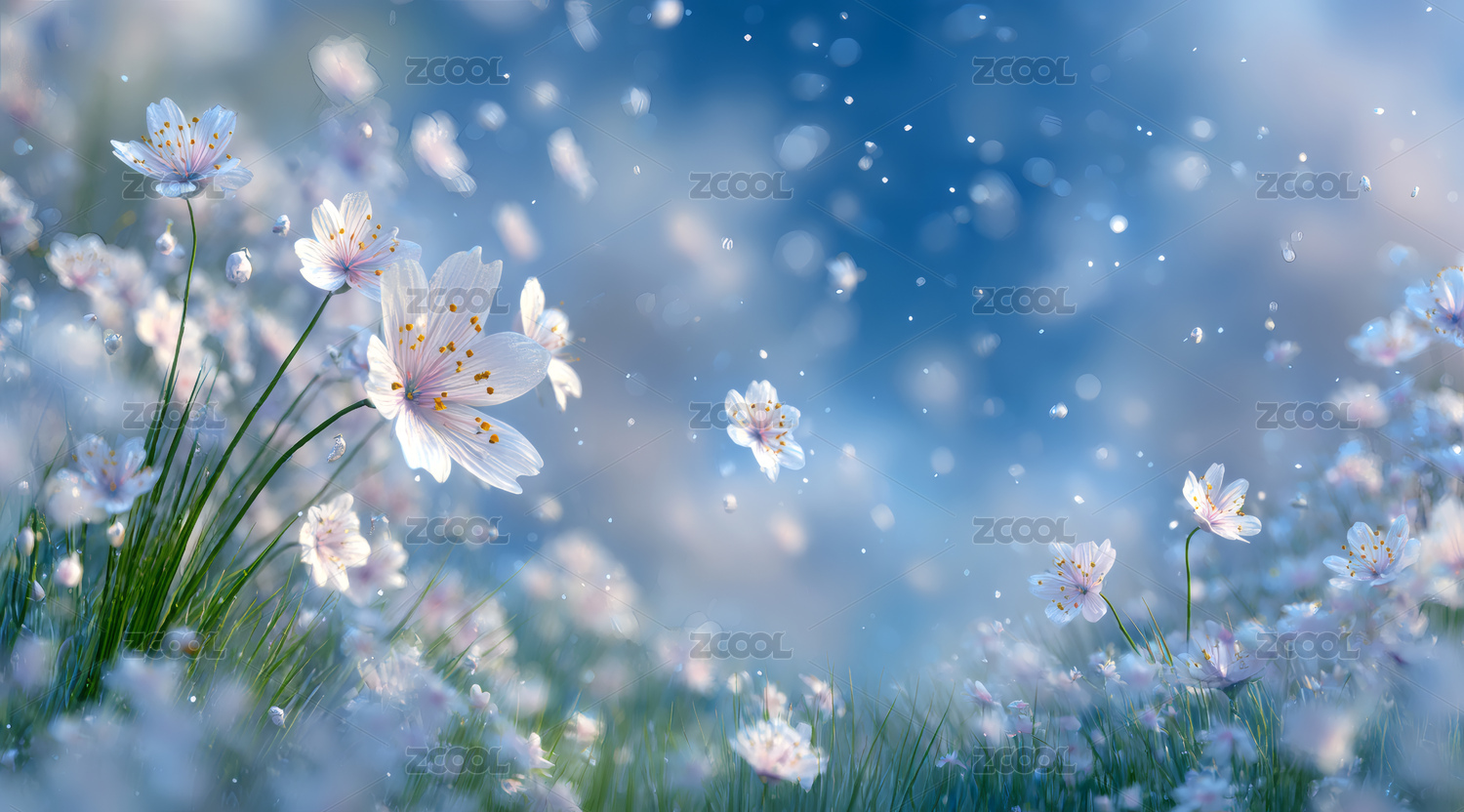 阳光下的粉色花朵盛开在绿草如茵的原野上