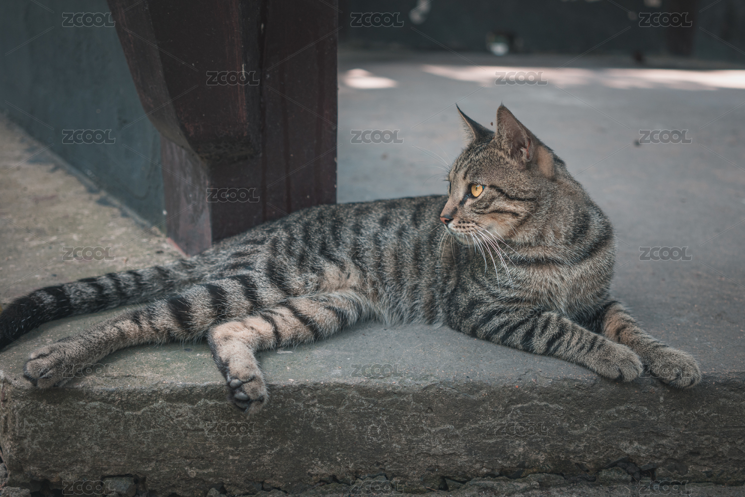 公园里的流浪猫,拥有灰色的条纹和橙色的眼睛