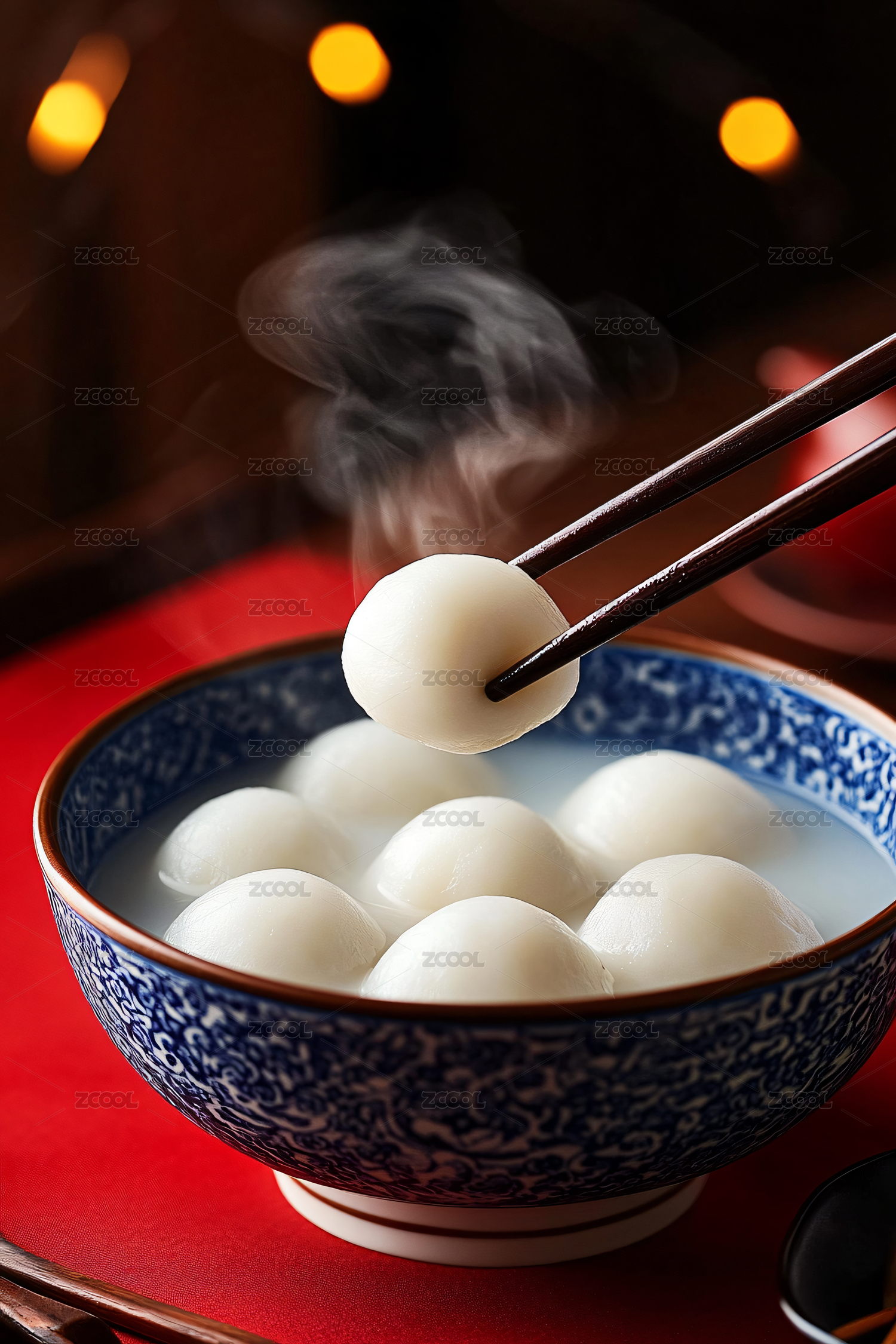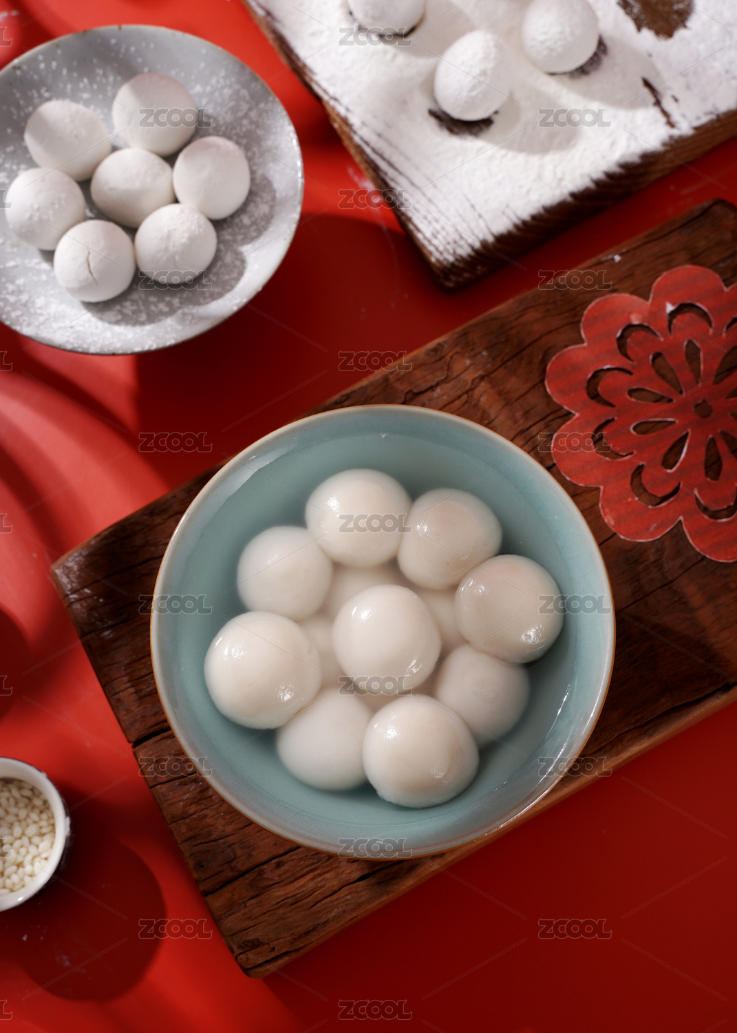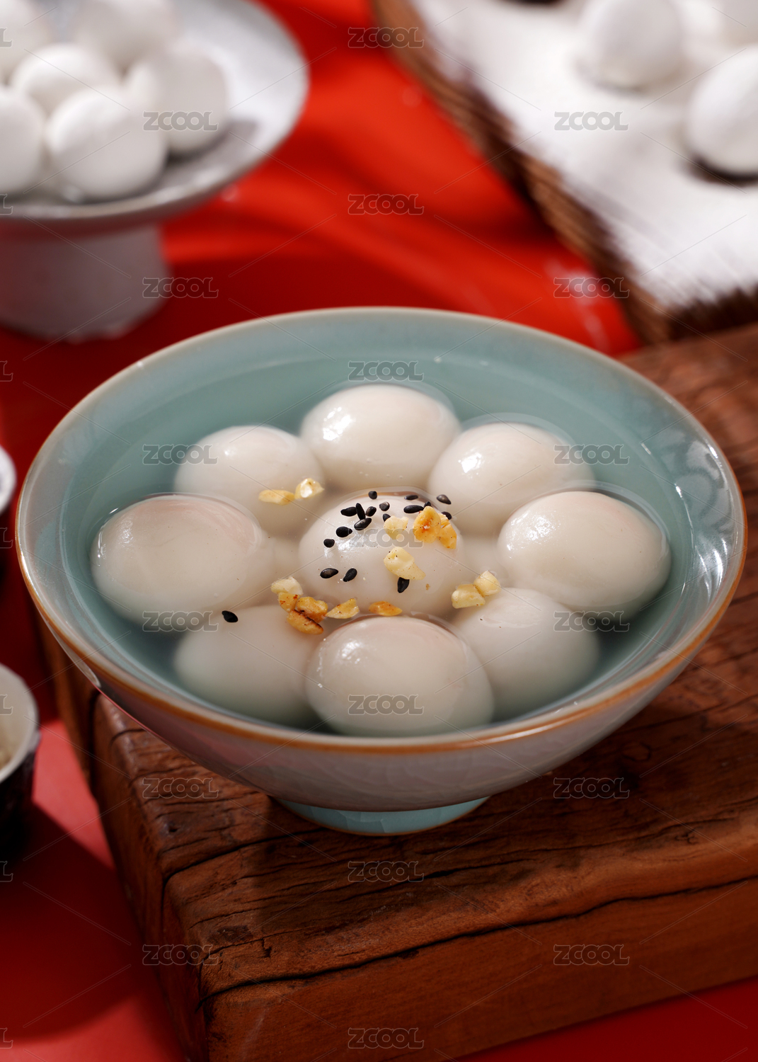 红底白碗汤圆茶具静物