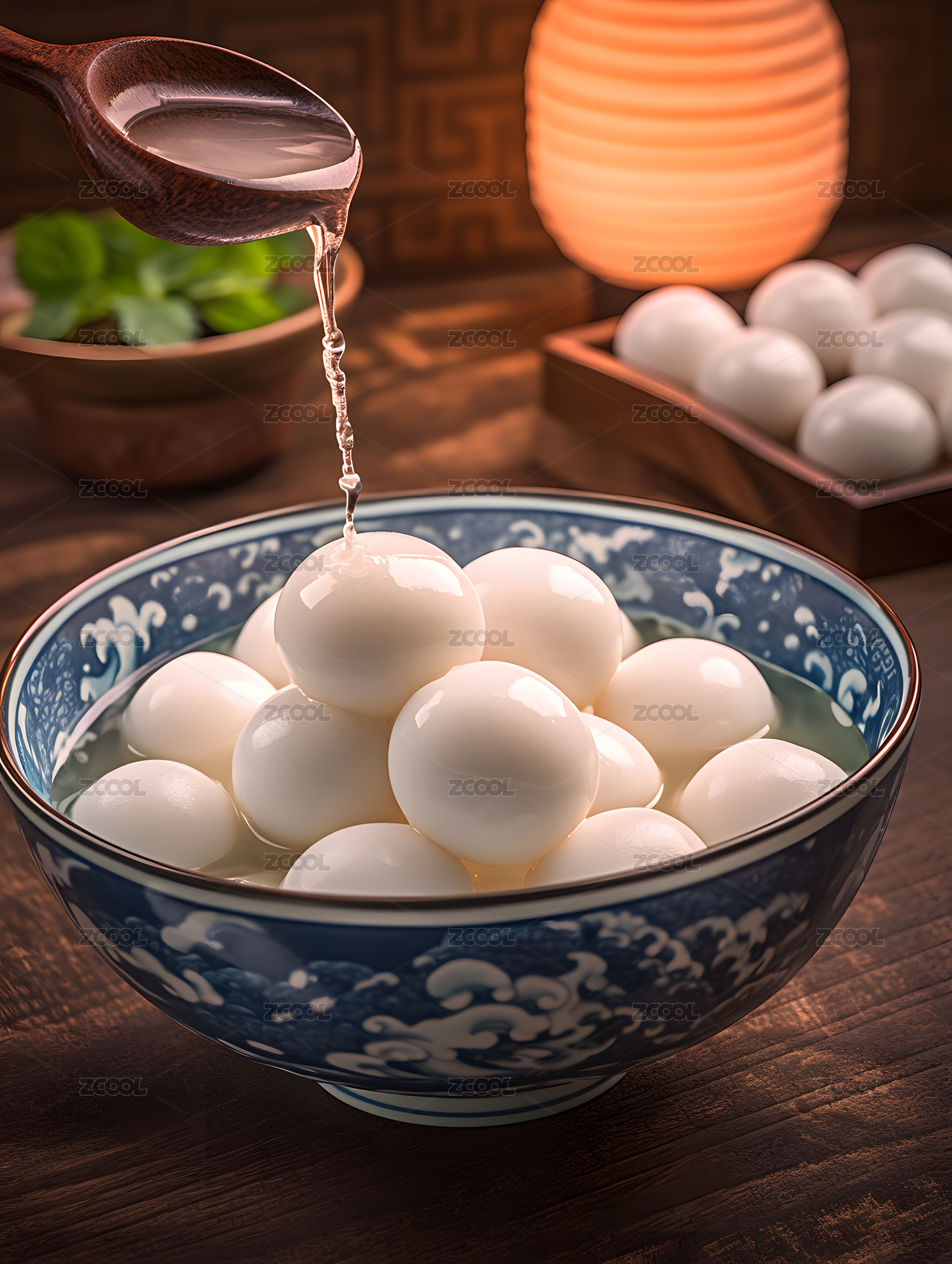 舀起木桌上放在白色瓷碗里的中国汤圆