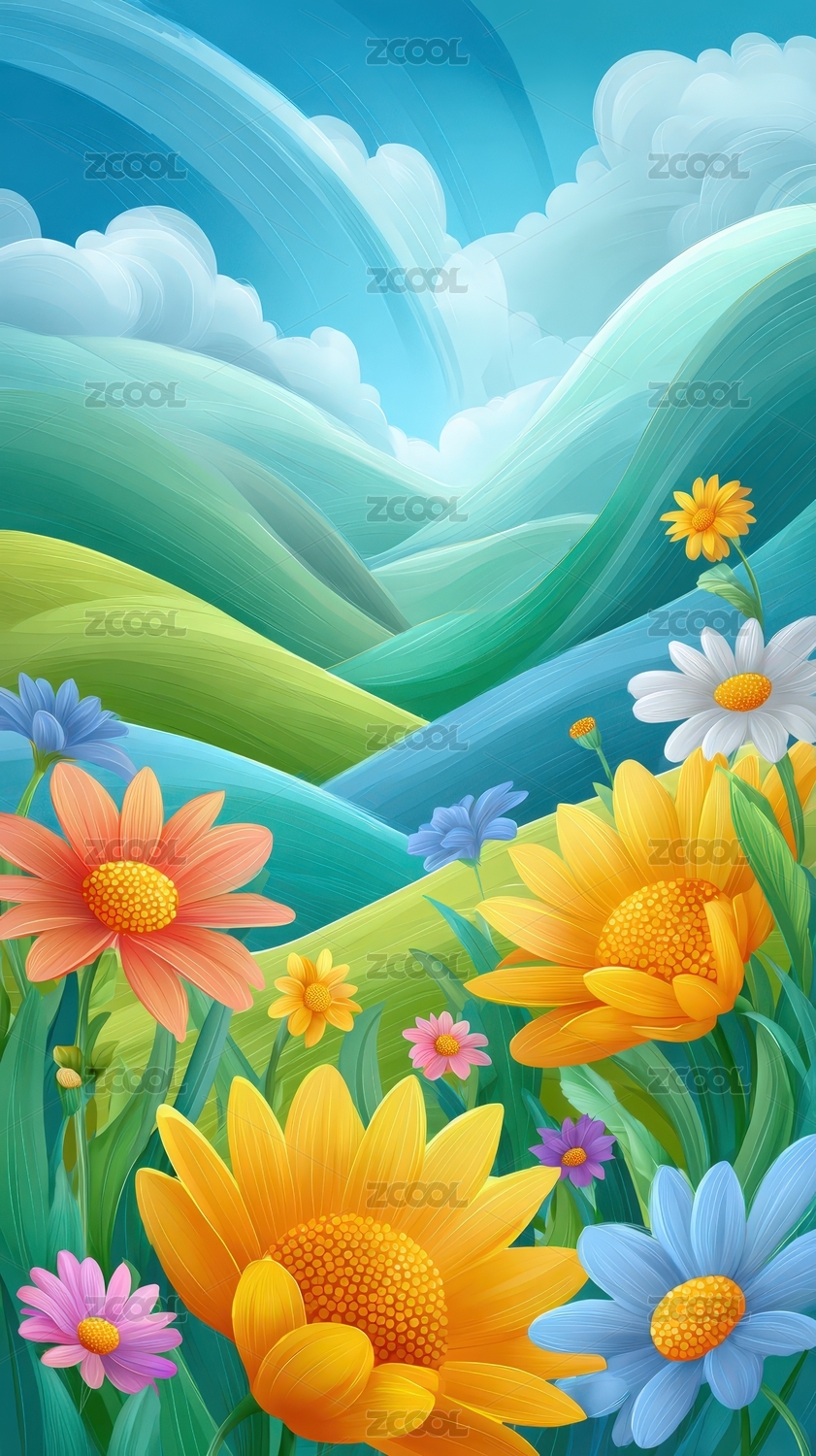 卡通春日田野风景