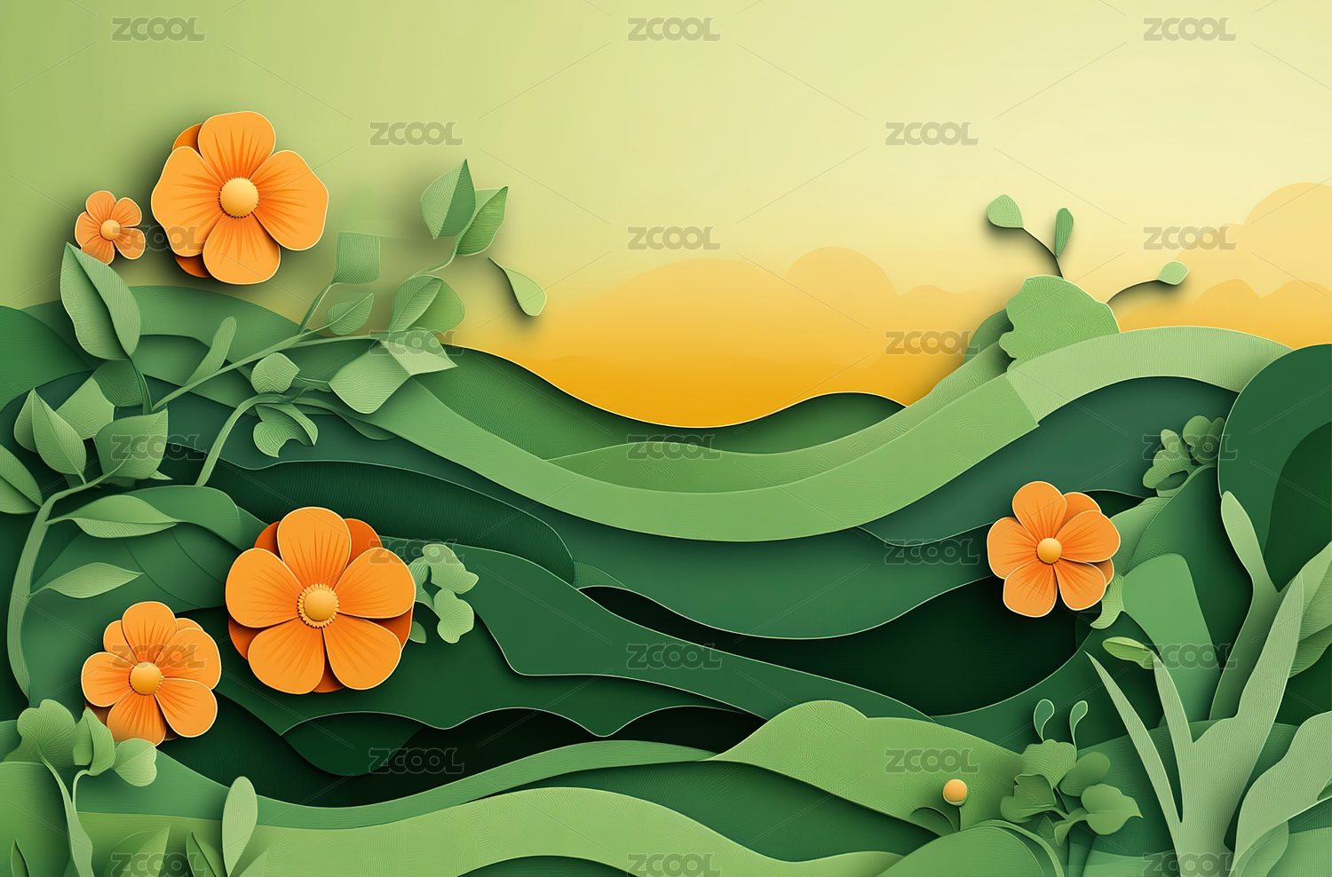 纸艺风格的山川河流花卉景观