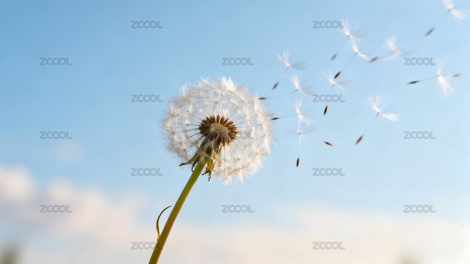 蓝天白云吹散的蒲公英植物