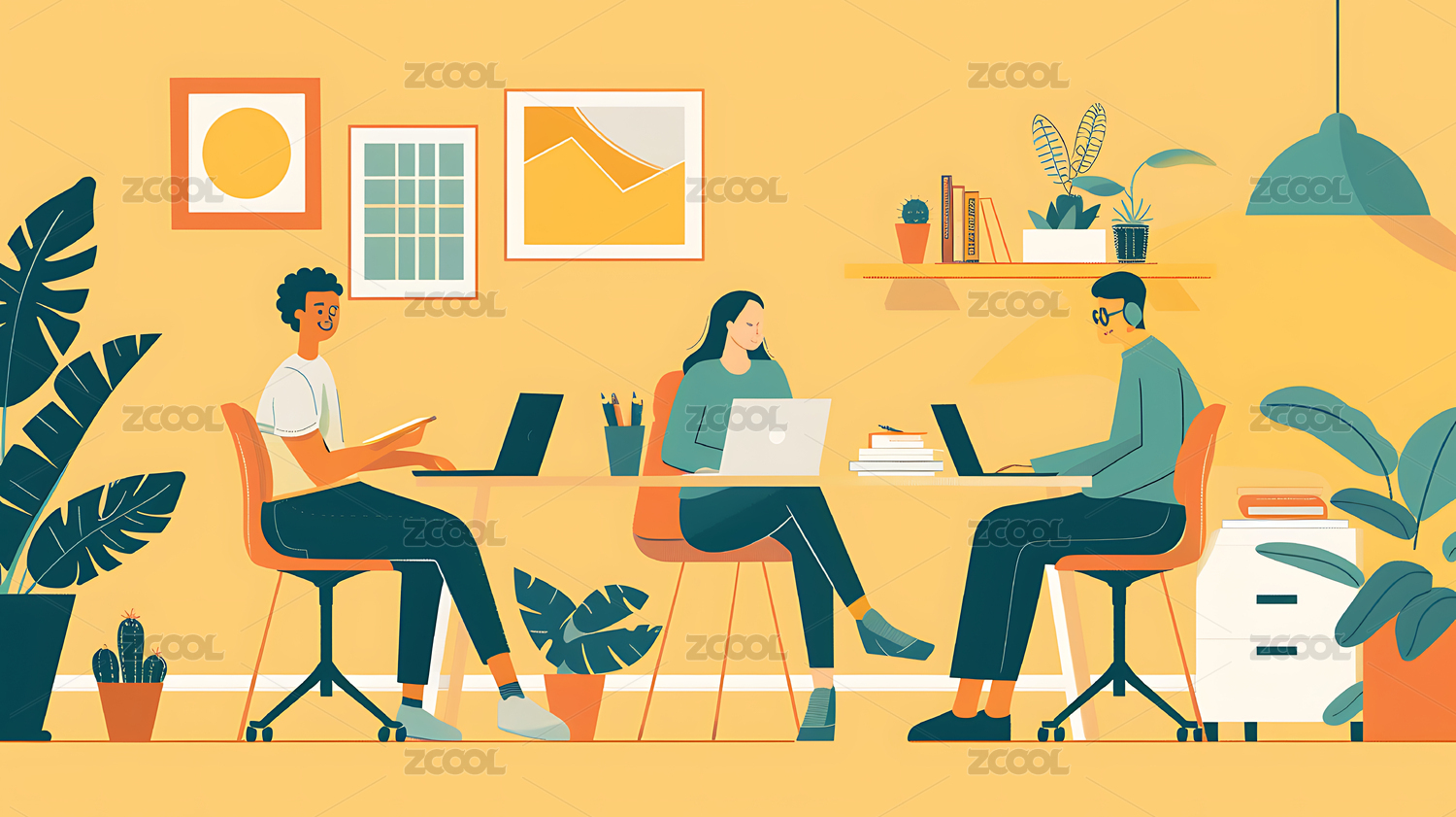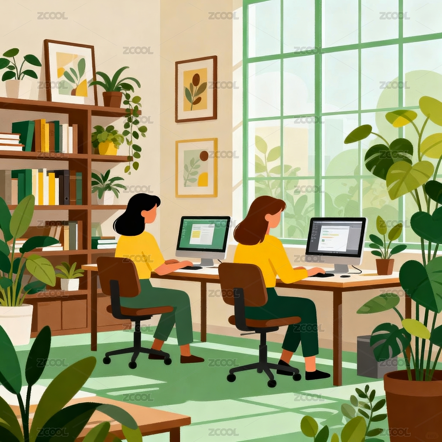 办公室,工作,电脑,植物,桌子,椅子,灯具,文件,书架