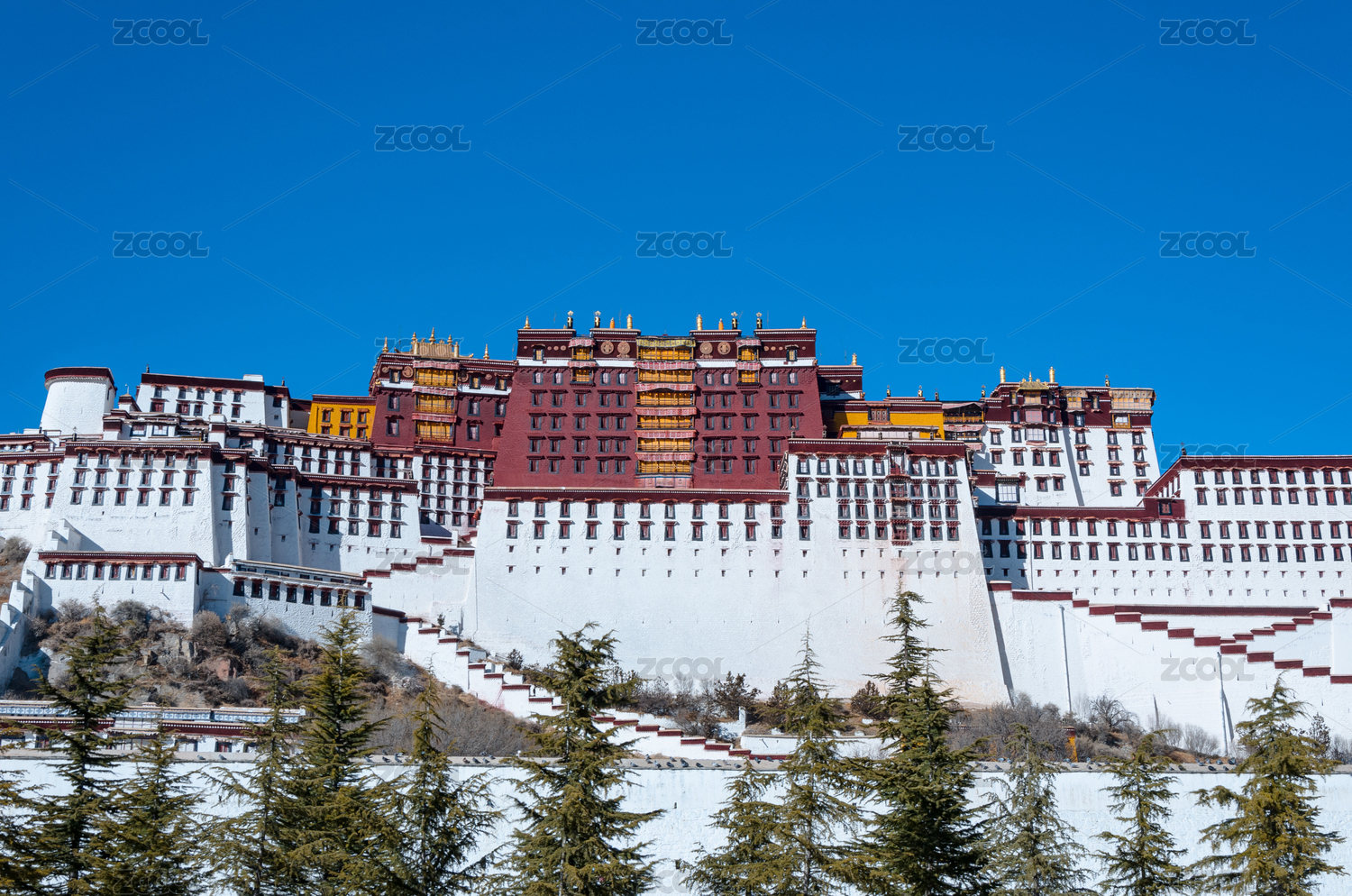蓝天下拉萨布达拉宫正面建筑白墙红墙黄墙