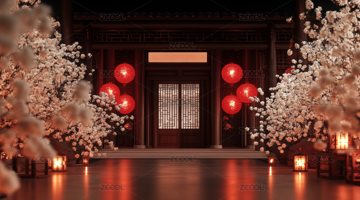 花朵,建筑,传统,庭院,静谧,古典,中式,灯笼,氛围,温暖